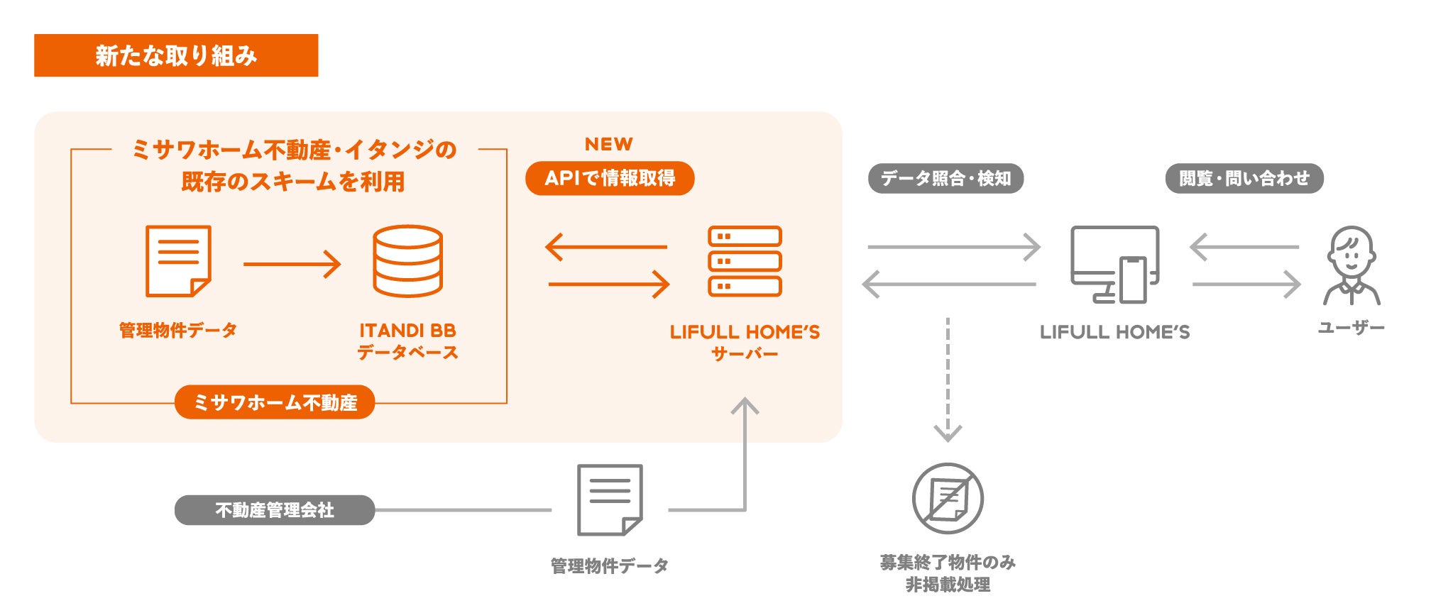 「LIFULL HOME'S」では今回、不動産会社の業務効率化システムを開発・運用するイタンジが提供するリアルタイム不動産業者間サイト「ITANDI BB(イタンジ ビービー)」よりミサワホーム不動産(居住用管理戸数36,541戸※2021年6月末時点)の管理物件情報をAPIで取得し、募集が終了した物件を「LIFULL HOME'S」に掲載されている物件情報と照合し、自動で非掲載にする仕組みを導入しました。
