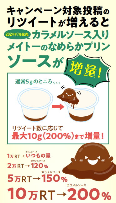 「なめらかプリンカラメル祭!」は、来年25周年を迎える協同乳業の大人気商品「メイトーのなめらかプリン」の周年企画のひとつとして実施いたします。2024年7月発売予定のカラメルソース入り「メイトーのなめらかプリン」のカラメルソース量を、SNSでのリポスト(リツイート)数に応じて決定し、消費者の皆様と一緒に25周年を盛り上げます。協同乳業公式X(旧Twitter)のキャンペーン対象投稿のリポスト(リツイート)数に応じて、カラメルソースが増量いたします。リポスト(リツイート)数が10万を超えると、ソース量はなんと通常の200%になります。