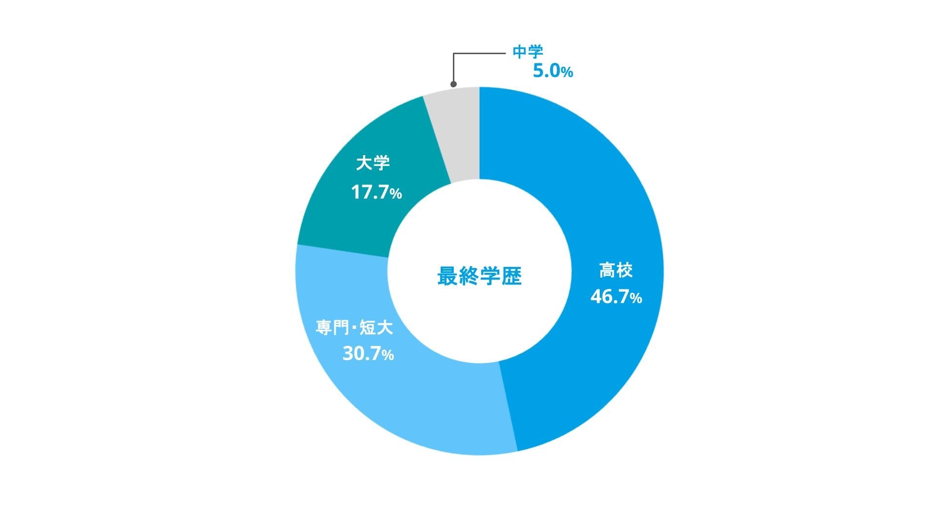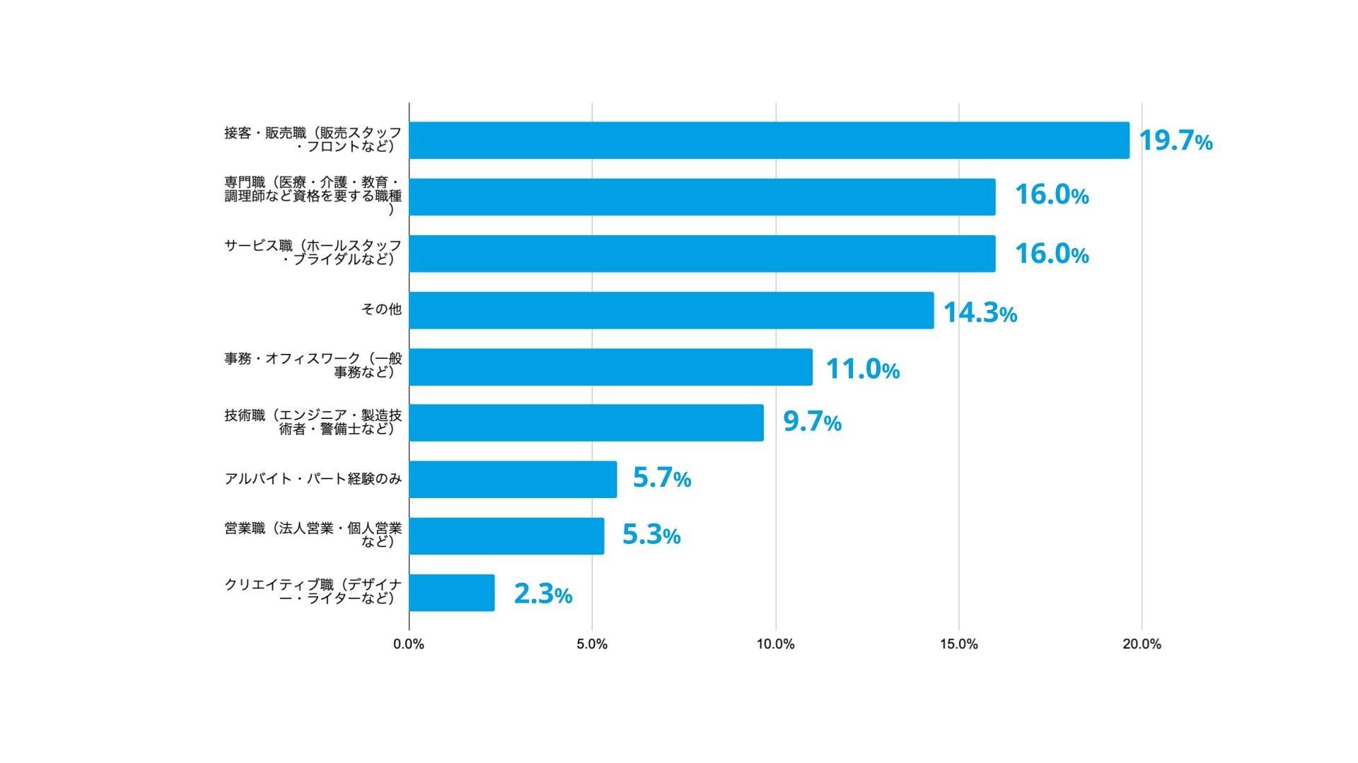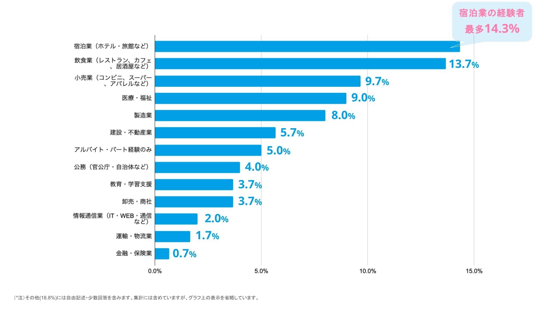 最初に就職した業界は、「宿泊業(14.3%)」「飲食業(13.7%)」「小売業(9.7%)」が上位を占めました。接客やサービス業など、人と関わる仕事の経験者が多い傾向が見られます。