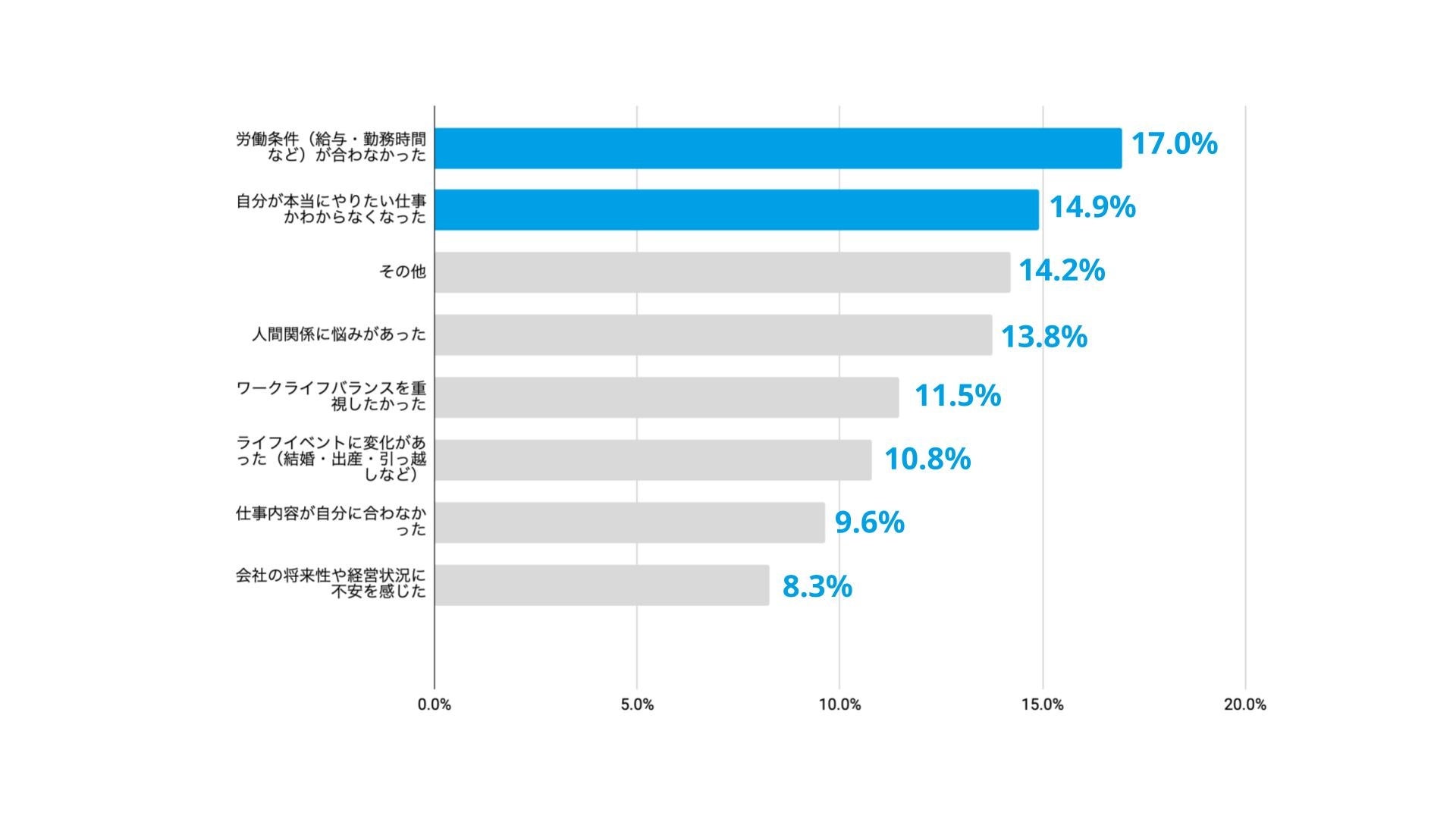 離職理由として最も多かったのは「労働条件(給与・勤務時間など)が合わなかった」(17.0%)、