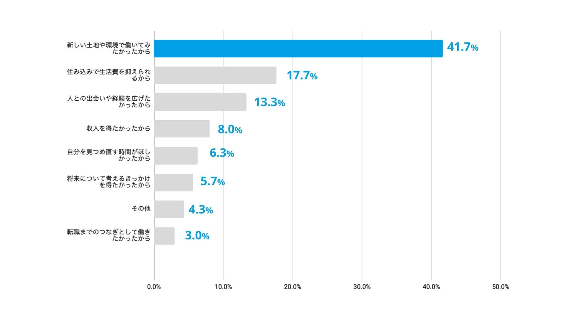 リゾートバイトを選んだ理由として最も多かったのは「新しい土地や環境で働いてみたかった」(41.7%)でした。