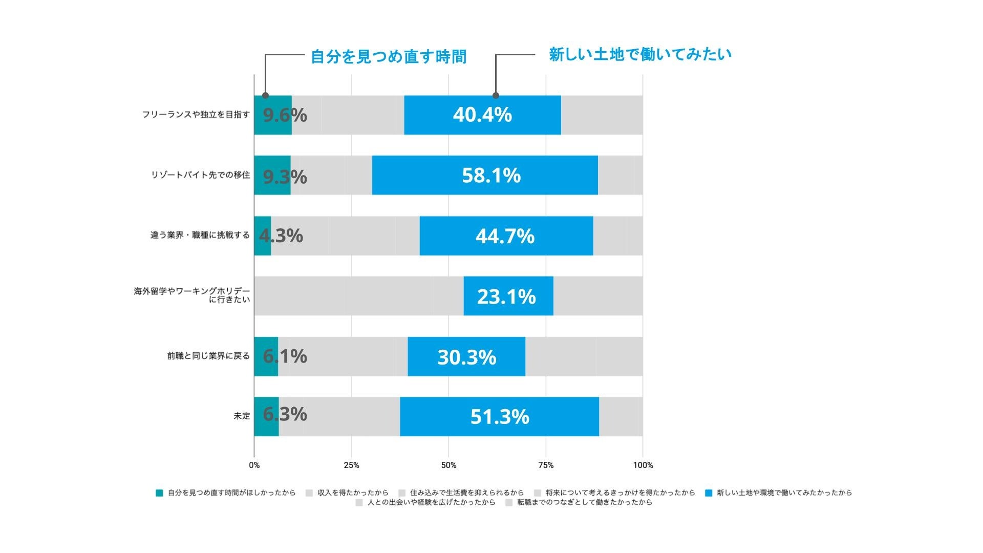 グラフからは、「新しい土地や環境で働いてみたい」と「自分を見つめ直す時間がほしかった」という2つの理由が、リゾートバイトの選択とその後のキャリア意識に強く影響していることがわかります。