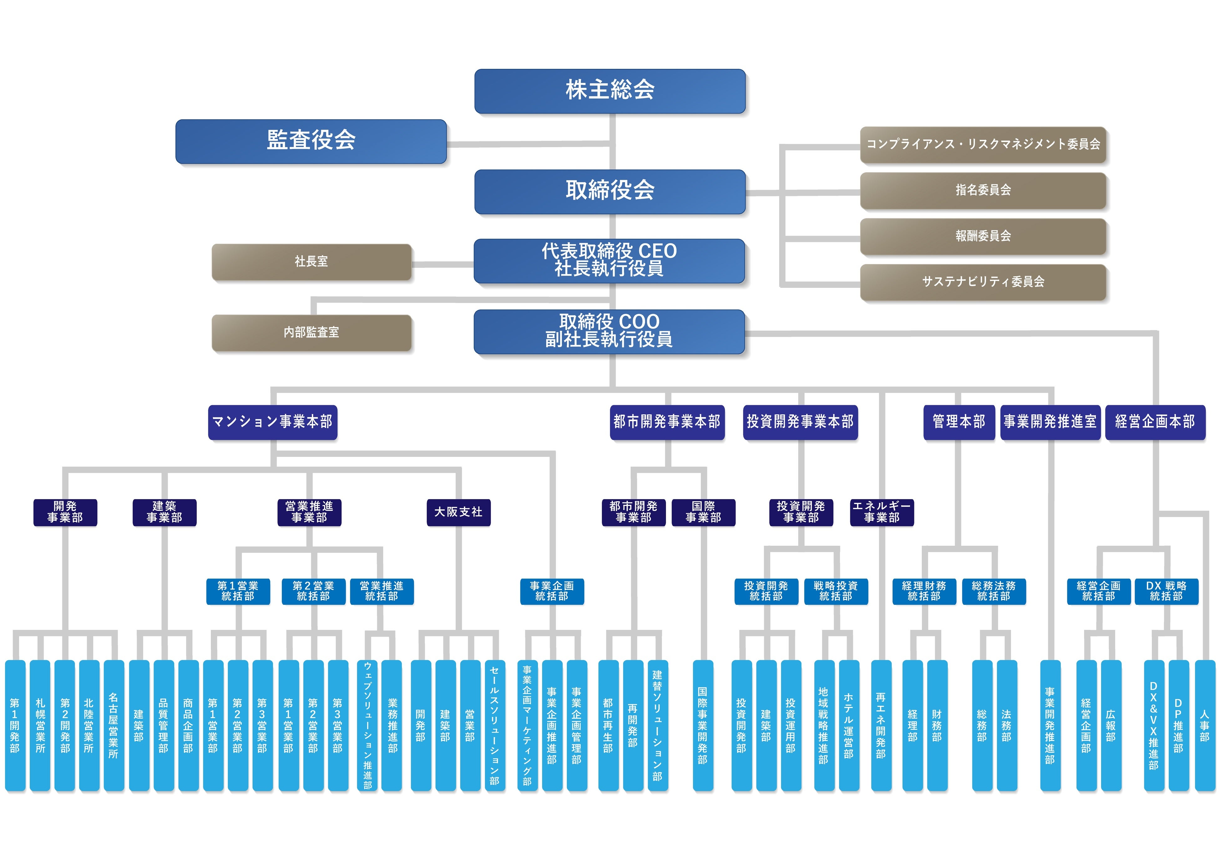 ・現在、マンション事業本部管轄下にある都市開発事業部を、「都市開発事業本部」に改編し設置する。これにより、当社は「マンション事業本部」「都市開発事業本部」「投資開発事業本部」「エネルギー事業部」「管理本部」「事業開発推進室」及び「経営企画本部」を置く事業本部体制となります。