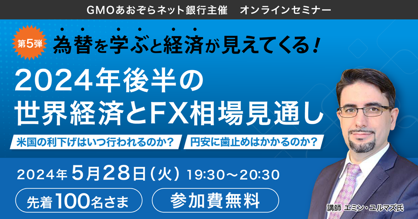 GMOあおぞらネット銀行株式会社(以下、当社)は、2024年5月28日(火)19:30より、人気エコノミスト・為替ストラテジストのエミン・ユルマズ氏を講師にお迎えし、「2024年後半の世界経済とFX相場見通し」をテーマに無料オンラインセミナーを開催いたします。
