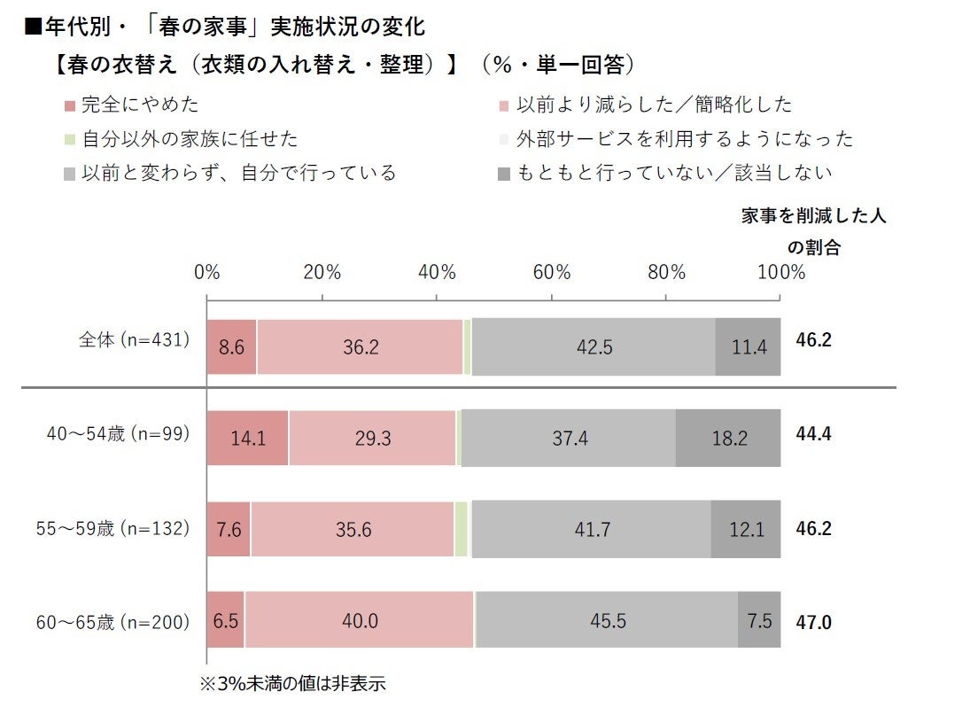 中でも「春の衣替え(衣類の入れ替え・整理)」は、「以前より減らした/簡略化した(36.2%)」と4割近く、「家事を削減した人※2の割合(46.2%)」が「以前と変わらず、自分で行っている(42.5%)」を上回った。40~54歳では、「もともと行っていない/該当しない(18.2%)」「完全にやめた (14.1%)」が他の年代よりも高い傾向に。かつて当たり前の家事の1つだった「衣替え」だが、若い年代ほど「やらない」方向へシフトしている様子がうかがえる。