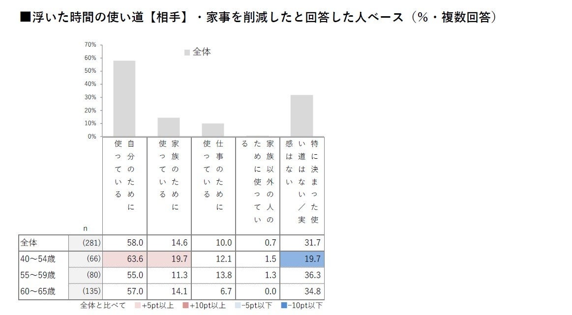 上述の「『春の家事』の現在の実施状況」について「家事を削減した」と回答した人に対し、「家事を手放したことで生まれた時間を、現在はどのような用途に使っていますか」と尋ねたところ「自分のために使っている(58%)」が半数以上を占めた。