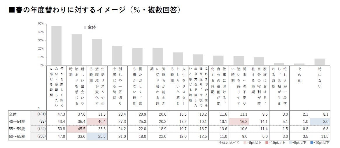 ■全国40歳~65歳のミドルエイジ女性の47.3%が、「春の年度替わり」に「何かを新しく始めたい・挑戦したいと感じる時期」と回答。中でも55~59歳では半数以上(50.8%)と他の年代より高い結果に