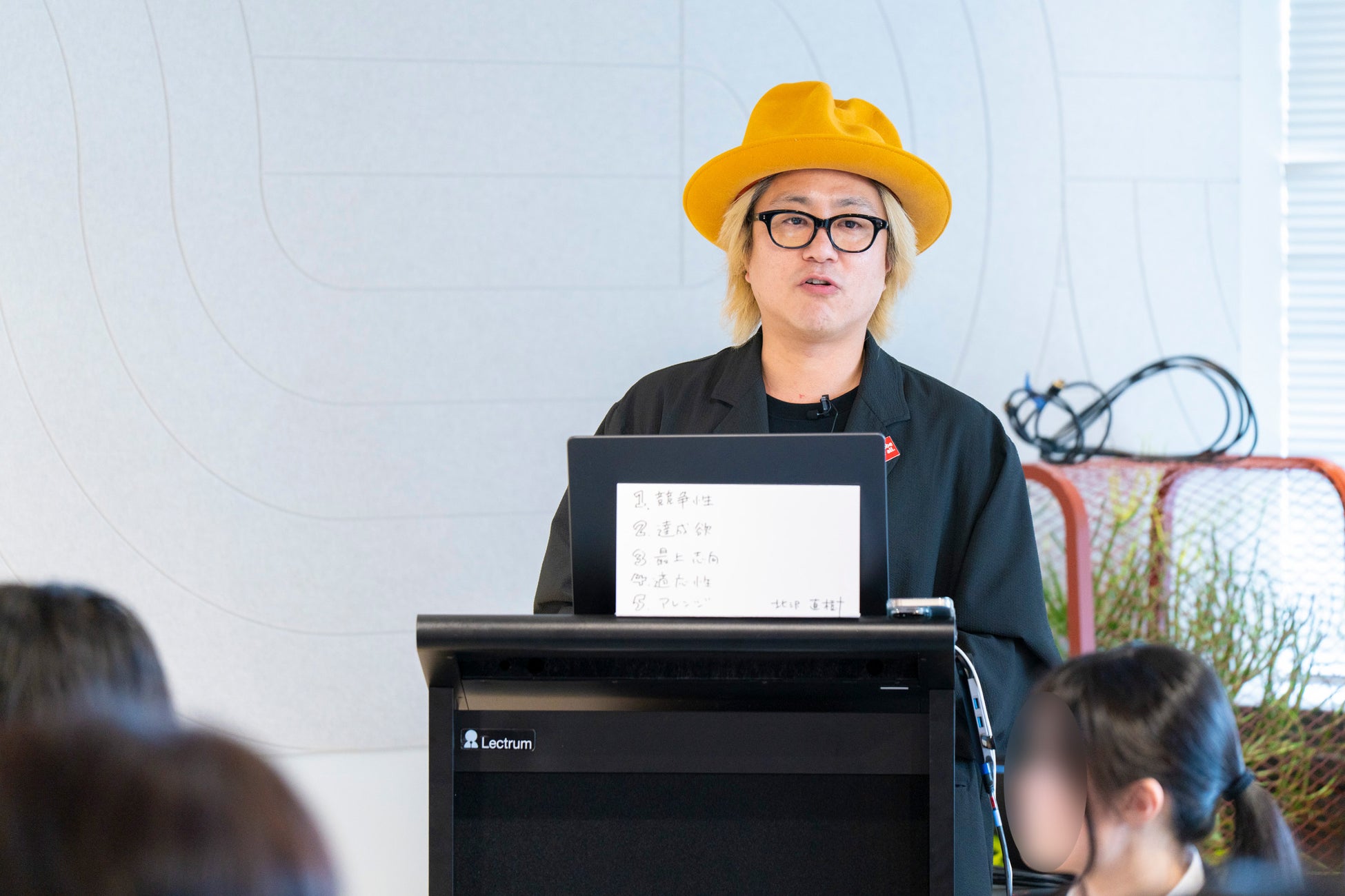 最後にイラストレーター/キャラクターデザイナーの北沢 直樹さんが登壇し、自己PRの最終ステップである魅力的なクリエイティブの作成についてレクチャーしました。まず、基本的なレイアウトや色、文字(文字組み)の原則を説明した後、ONE CAREER上でAdobe Expressを立ち上げて就活の自己PRに最適化したテンプレートを選択。自身の画像や強みを基にしたキャッチコピーなどを編集・配置し、自分らしさを最大限に伝える自己PRシートを作成しました。