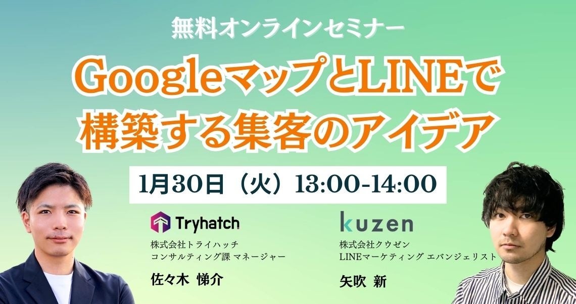 株式会社ベクトル(本社:東京都港区、代表取締役会長兼社長:西江 肇司、東証プライム:6058)の子会社である株式会社トライハッチ(東京都新宿区、代表取締役社長、武藤 尭行、以下、トライハッチ)は、株式会社クウゼン(本社:東京都千代田区、代表取締役CEO:太田 匠吾、 以下、クウゼン)と共同で、無料オンラインセミナー「店舗の集客を強化!GoogleマップとLINEで構築する集客のアイデア」を2024年1月30日(火)13:00~14:00に開催いたします。