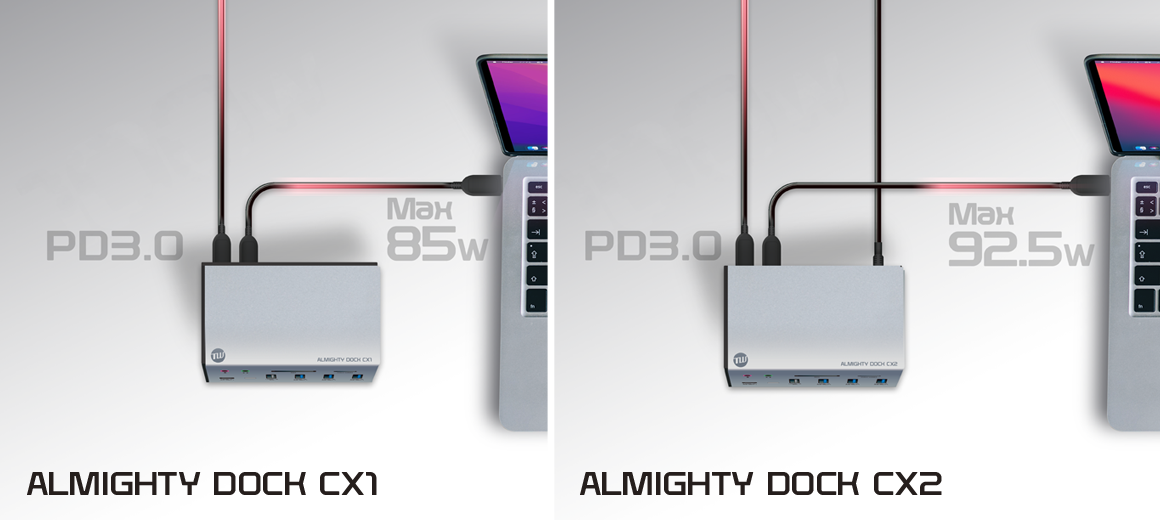 ※2 PDの電力について。ALMIGHTY DOCK CX1は、PDポートから充電時、100Wの電力が受電されますが、本機器で15Wを消費し、接続したデバイスには最大85W(理論値)の受電となります。ALMIGHTY DOCK CX2は、電源アダプタ使用時も本体で7.5Wを使用するため、接続したデバイスには最大92.5W(理論値)の受電となります。いずれの製品も本製品とは別に充電アダプタ、USB-Cケーブルが必要です。