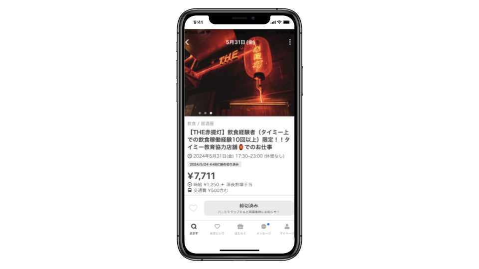 また、「飲食人材を育成する店舗に興味がある」「初心者でも働ける飲食店で働いてみたい」などの理由から、オープン当初から「THE 赤提灯」はワーカーから注目を集め、「タイミー」アプリで「THE 赤提灯」をお気に入り登録するワーカーは2024年5月末時点で2,600人を突破しました。勤務を体験して「また働きたい」ワーカーや、まだ働いたことがないが「働いてみたい」ワーカーの母集団が形成されており、「THE 赤提灯」では、2週間分の約30件の求人を公開すると、全て24時間以内にマッチングしています。
