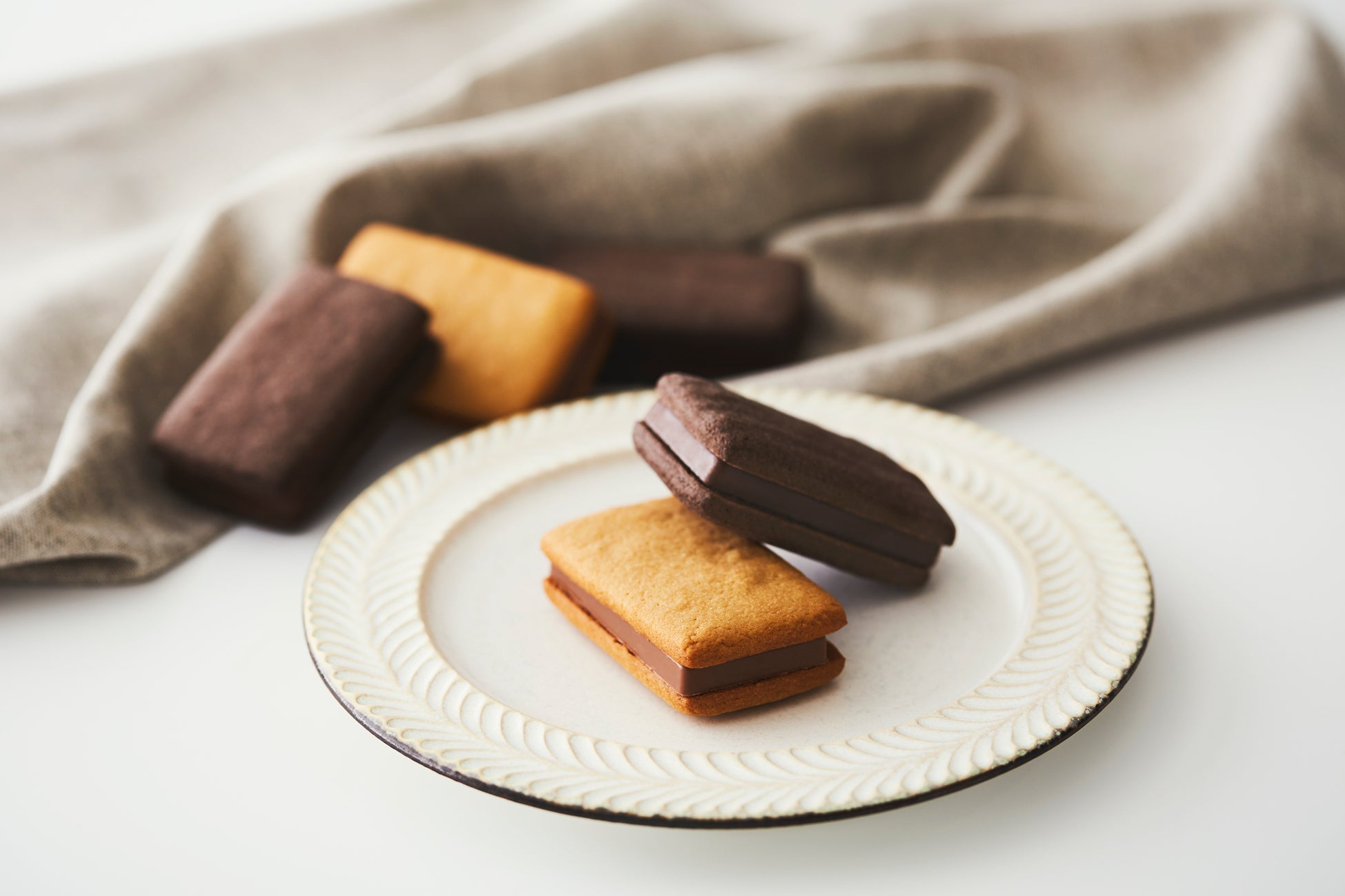 キャラメル、キャラメル風味のショコラクリーム、アーモンドをサブレでサンドした"キャラメルナッツ"、ミックスベリージャム、ミックスベリー風味のクリームをアールグレイ香るサブレでサンドした"ベリーアールグレイ"、キルシュ漬けグリオットとトンカ豆が香るバニラクリームをサンドした"バニラグリオット"、ビターガナッシュ、ショコラクリーム、オレンジピールをココアサブレでサンドした"ショコラオランジュ"の4種のフレーバーをご用意しております。