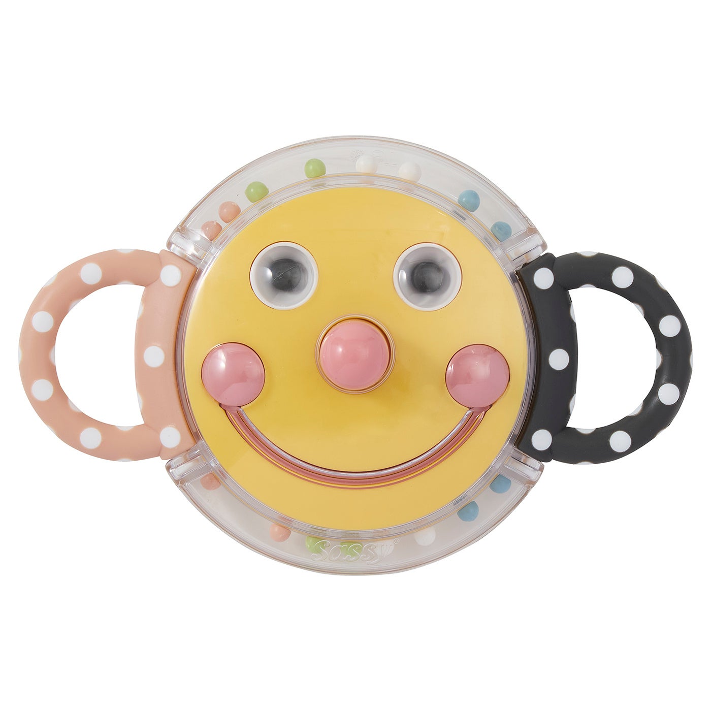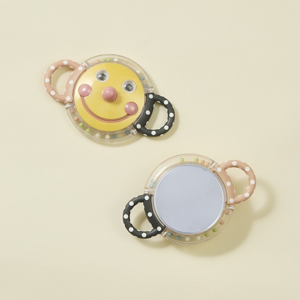 ニッコリ笑顔のキュートなラトルは、赤ちゃんが認識しやすい左右対称のデザイン。持ちやすいハンドル付きで、振るとビーズがカラカラ、お鼻を押すとキューキュー音が鳴り、赤ちゃんの好奇心を刺激します。裏面のミラーで「いないいないばあ!」を楽しみながら、自己認識を応援します。
