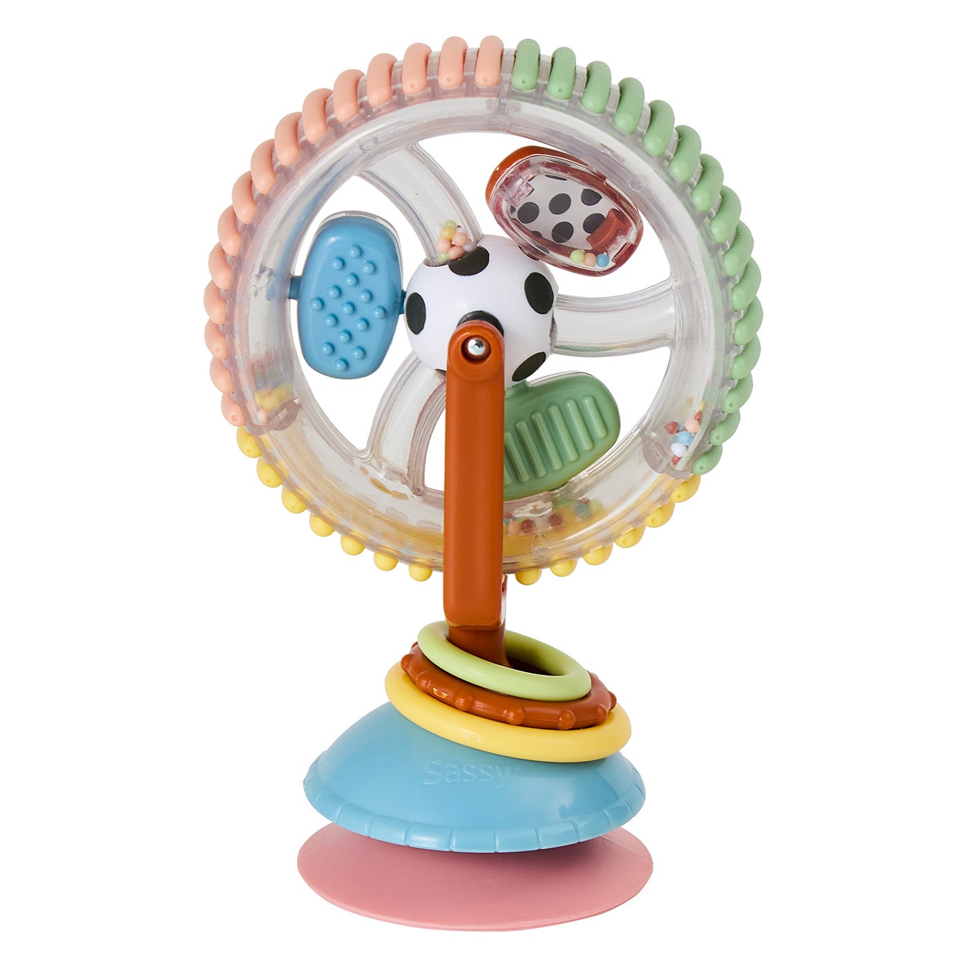 回すたびにビーズがさらさらと心地よい音を奏でる、かんらんしゃのおもちゃ。パーツごとに異なる色、柄、デコボコ加工が施されており、見て・聞いて・触って、赤ちゃんの五感を刺激します。吸盤でテーブルなどに固定できるため、テーブル、ハイチェアでの一人遊びにも最適です。