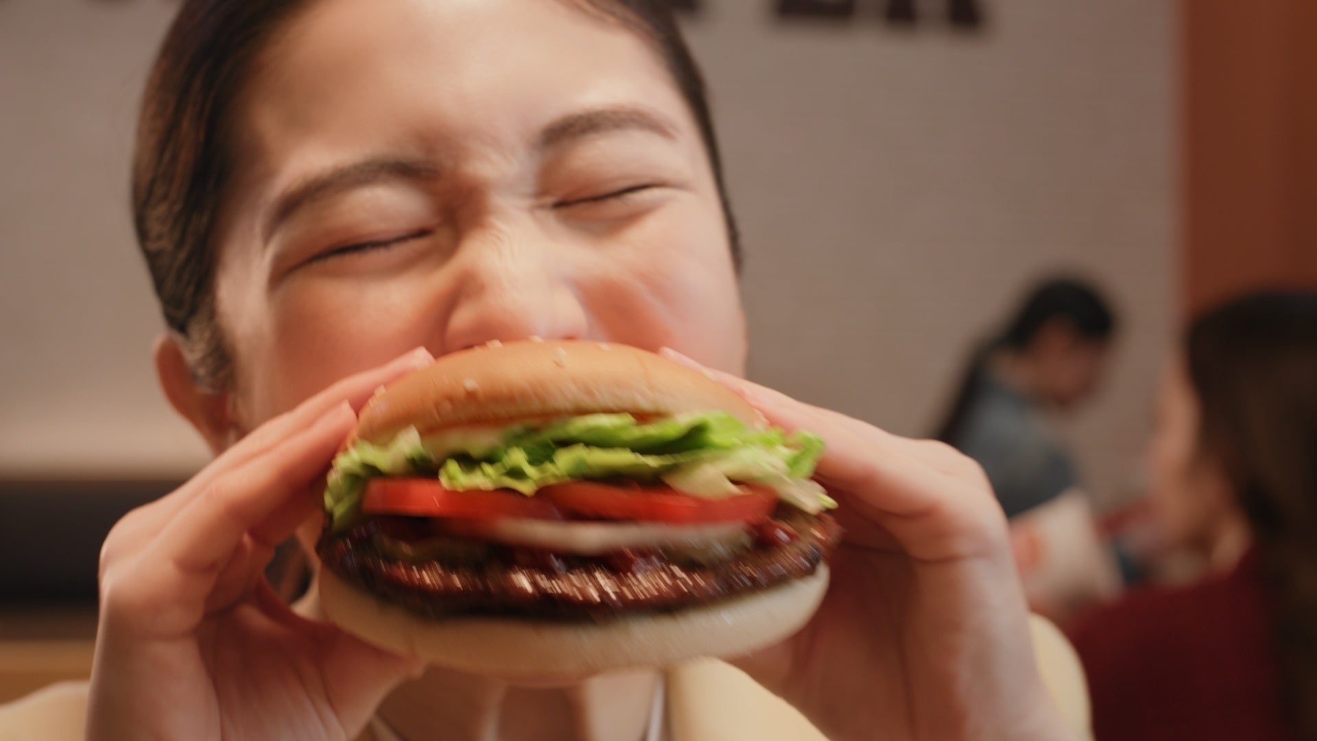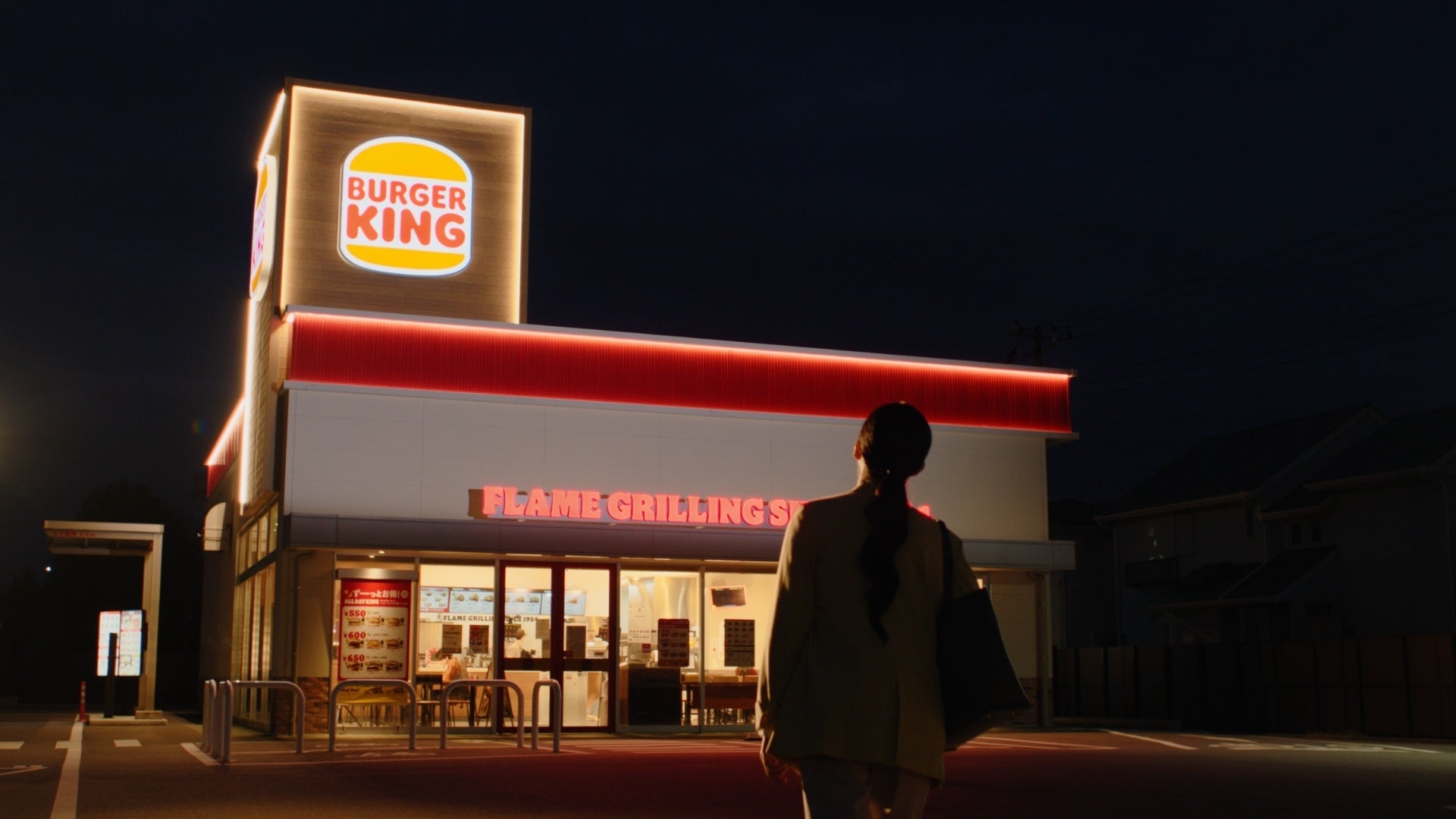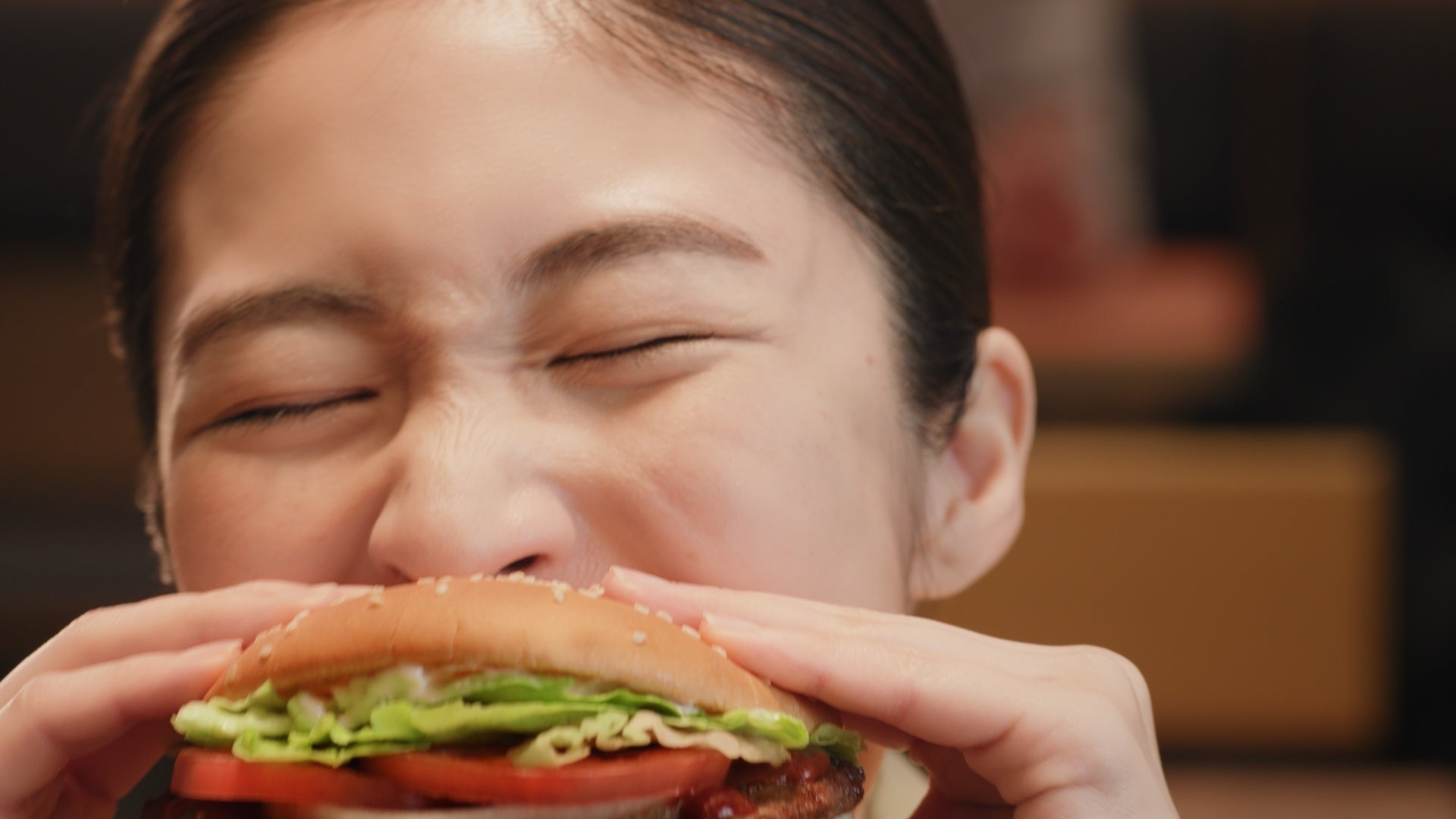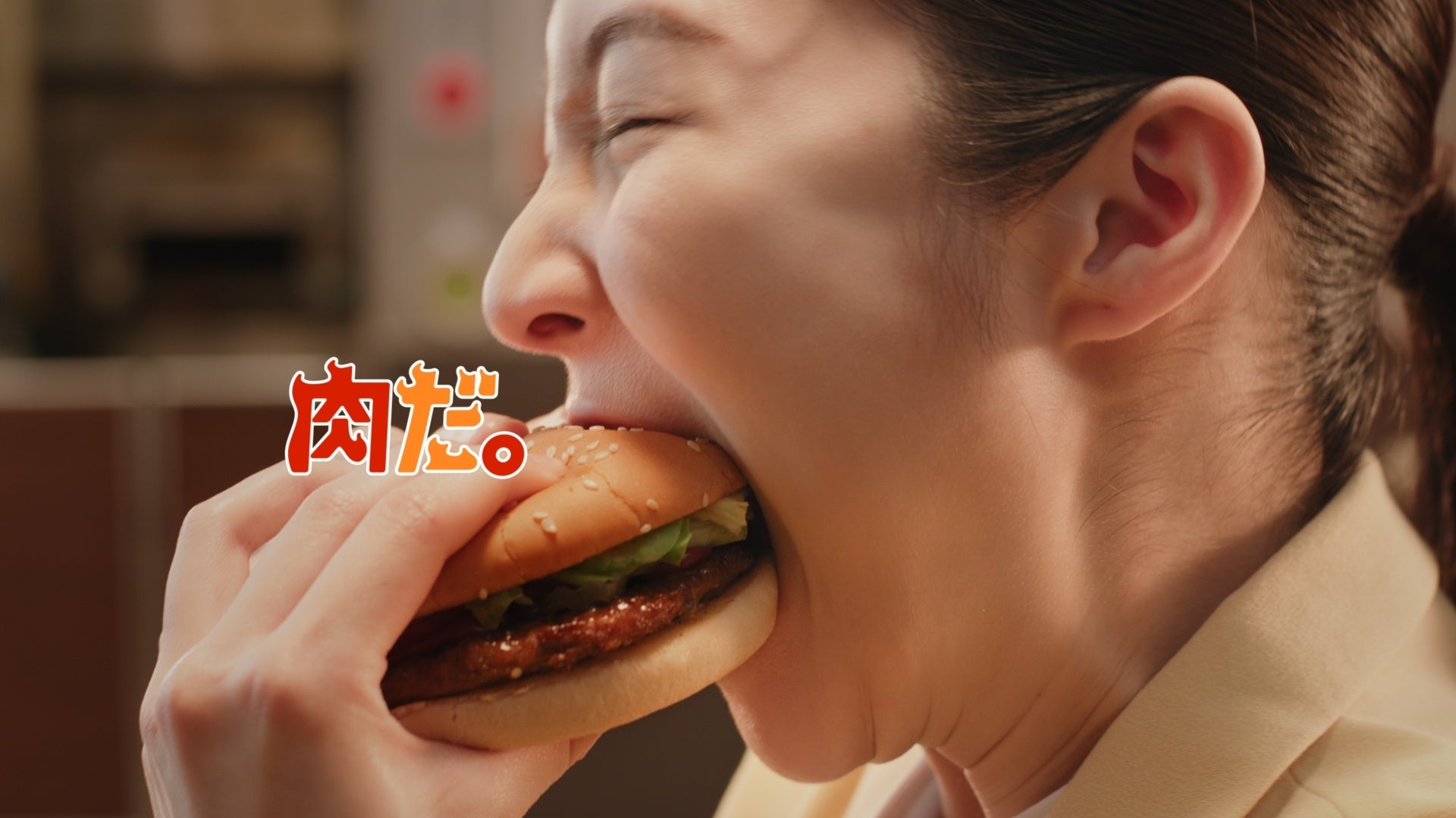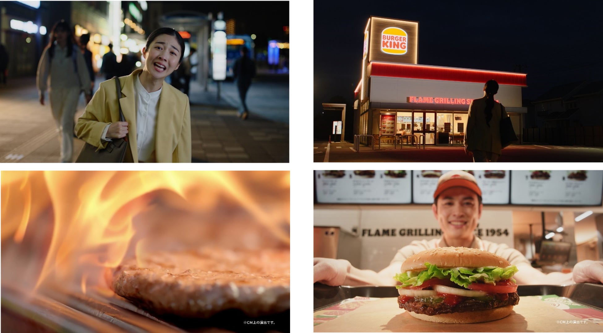 本TVCMでは、仕事帰りにお腹を空かせた女性が「肉」を求めて歩きバーガーキング® に辿り着きます。店内でバーガーキング® 自慢の直火焼きの100%ビーフパティを使用した本格バーガー『ワッパー® 』に思い切りかぶりつく。「肉だ。直火だ。食事だ。」のメッセージとともに、食事を思い切り楽しむ姿を印象的に描いています。