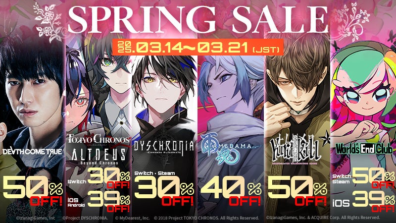 株式会社イザナギゲームズ(東京都江東区、プロデューサー兼CEO:梅田慎介)は、『Death Come True【デスカムトゥルー】』、『ワールズエンドクラブ【World's End Club】』、『冤罪執行遊戯ユルキル』、『DYSCHRONIA: Chronos Alternate【ディスクロニア クロノスオルタネイト】』、『雨魂 - AMEDAMA -』、『東京クロノス&アルトデウス: ビヨンドクロノス ツインパック』の6作品のスプリングセールの実施を発表いたしました。