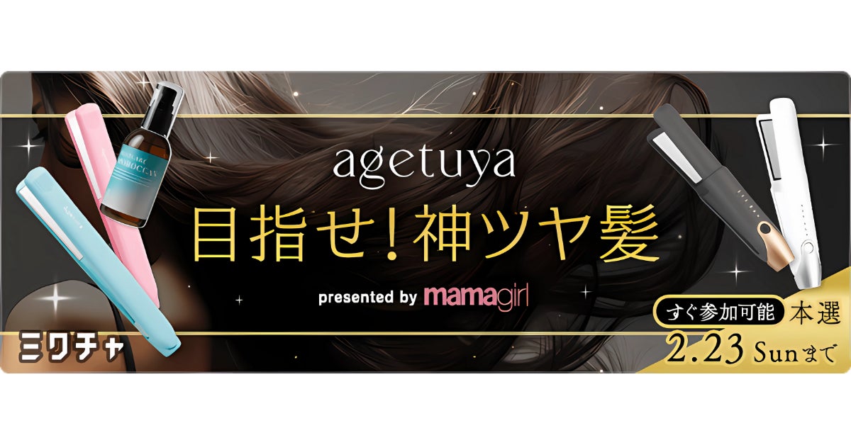 ヘアアイロンブランド「agetuya(アゲツヤ)」を展開する株式会社ローネジャパンは、ママ向け情報がたっぷりの「mamagirl WEB」、ライブ配信&動画アプリ「ミクチャ」とのコラボイベントを2025年2月17日(月)~2025年2月23日(日)にかけて開催いたします。ミクチャ内のムービーとライブ配信の合算獲得ポイント数に応じて、ランキング上位の方には「神ツヤ髪」を目指せるagetuyaの人気製品をプレゼントいたします。