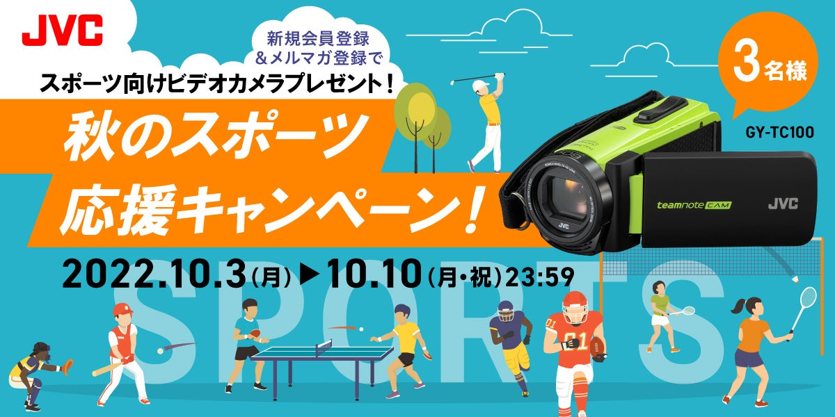 株式会社JVCケンウッドは、公式オンラインストア「JVCケンウッドストア」に新規会員登録&メルマガ登録いただいた方から抽選で3名様に、学校の部活動からクラブチームまで、スポーツ選手の上達をサポートするスポーツ専用ビデオカメラ “teamnote CAM” 「GY-TC100」をプレゼントする、秋のスポーツ応援キャンペーンを本日より実施します。キャンペーン期間は、2022年10月3日(月)~2022年10月10日(月・祝)23:59です。