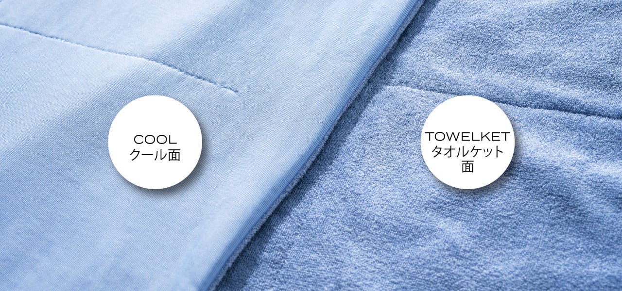 接触冷感と持続冷感のダブル冷感で究極の冷たさを実現したクール面とタオルケット面のリバーシブル仕様で睡眠中の快適さをサポートします。
