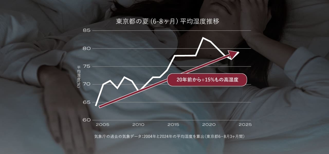 2023年、2024年の夏は2年連続で記録的な猛暑となりましたが、気象庁によると2025年の夏も全国的に平年より高い気温になることが予想されています。※1 最高気温が30℃以上を記録する真夏日の訪れも年々早期化しており、例年4月に観測されているところ、2025年は3月26日に全国の複数地点にて観測されました。※2 近年は気温に加え、湿度の上昇も顕著であり、2004年と比較すると平均湿度推移が約15%上昇していることがわかり、※3 その外気湿度は室内湿度ひいては寝床内湿度にも影響を及ぼしています。※4 湿度と睡眠の質は密接に関係しており、睡眠時の快適な寝床内湿度は50%前後とされています。高湿度の環境下では、体温の放散が十分にできず寝汗をかきやすくなり、中途覚醒が増加、さらにアレルギーの原因になるダニ・カビの発生リスクも高まります。また、蒸し暑い季節はかけ布団を使用しない選択肢も多数見受けられますが、冷房の冷風を直接受けることによる冷え過ぎや疲労なども蓄積されます。ブレインスリープでは蒸し暑い季節においても就寝時の掛け布団使用を推奨していることから、高気温と高湿度を同時にコントロールし、“究極冷感”と“超涼感”が目覚めまで持続し、快眠を促す夏用掛け布団を開発しました。