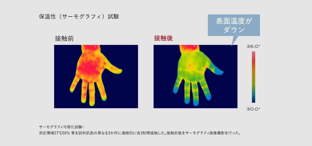 究極の冷感を求め、一から糸と生地を独自開発し、接触冷感Q-MAX値は、基準値である0.2の約260%にあたる0.524(Q-MAX 最大熱吸収速度w/ ㎡ ) を実現。洗濯などによる機能低下もない究極冷感生地で、接触することで効果的に吸熱して、冷たさを感じます。