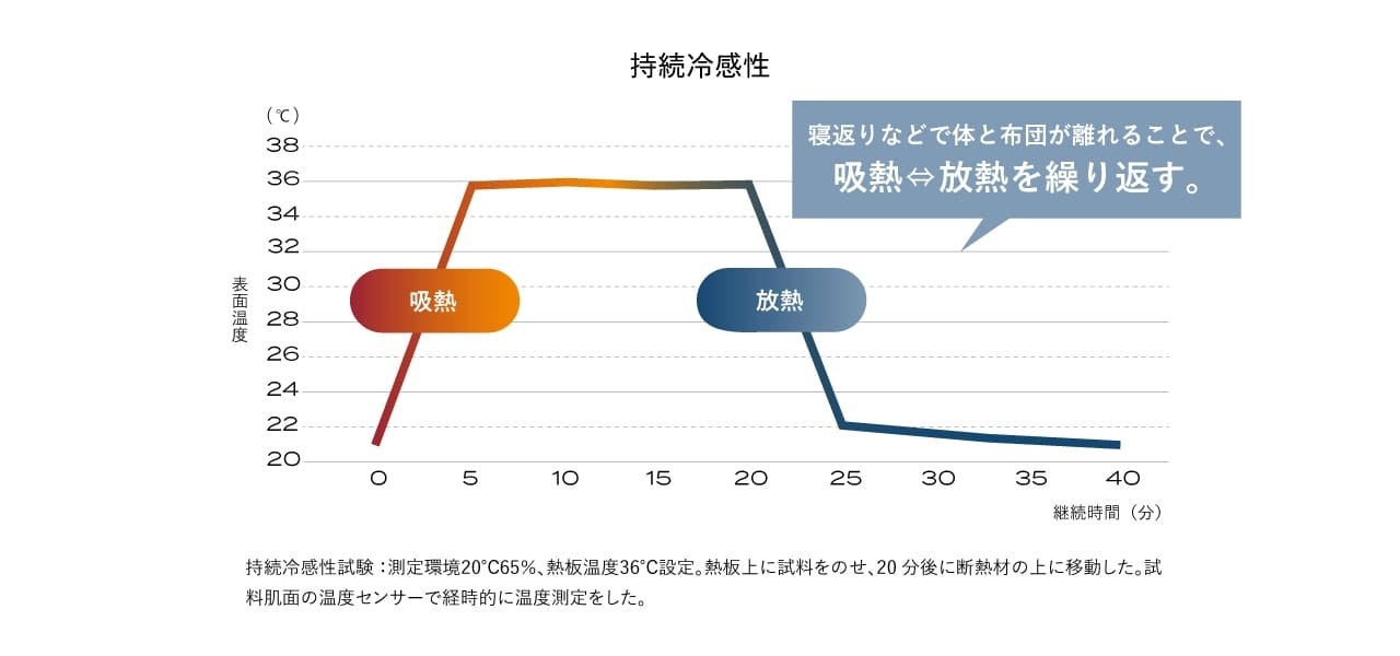 中わたの繊維に、宇宙服のために開発された革新的な冷感テクノロジーPCMをマイクロカプセル化し配合。一般的な接触冷感寝具は、吸熱した熱が飽和状態になるとその冷感性は損なわれますが、エアースローは、睡眠中の寝返りなどにより布団と体が離れることで冷感が復活し、維持します。