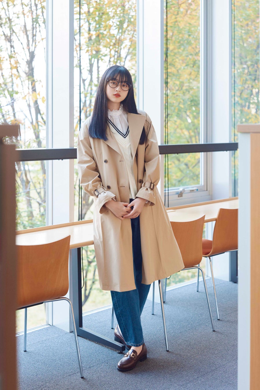入学式や就職活動などスーツに羽織るのはもちろん、私服に合わせて通学や通勤での普段使いもしやすいトレントコート。きちんと感に加え、シフォン素材のバックプリーツや、袖口のベルトで2Wayのシルエット変化を楽しめるキャンディースリーブ仕様などが、気分を上げてくれます。今シーズンは、知的なネイビーを新色で展開します。(2024年2月上旬入荷予定)