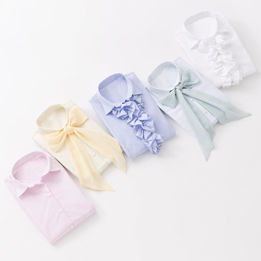 同一化しやすい入学式スーツの着こなしに選ぶ楽しみを。好みの色、似合う色がきっと見つかります。全てのカラーがフリル・リボン・スキッパーの3WAY使用なのも嬉しいポイント。