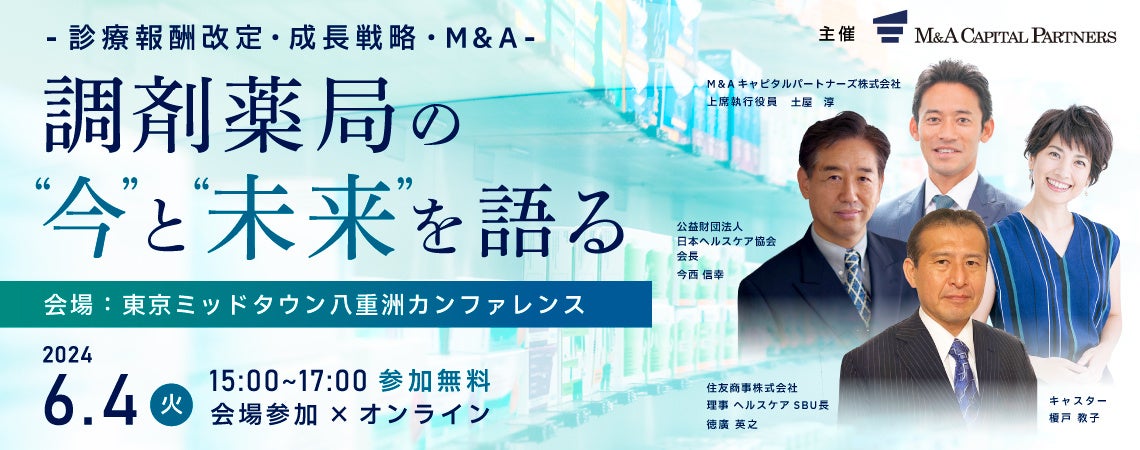 本セミナーでは、住友商事ヘルスケアSBU長の徳廣様と日本ヘルスケア協会の今西会長をお招きし、診療報酬改定への対応策として薬局経営の効率化や収益性の向上を図る方法、M&Aを活用した成長戦略など、今後の調剤薬局経営に必要な経営の着眼点について考察します。