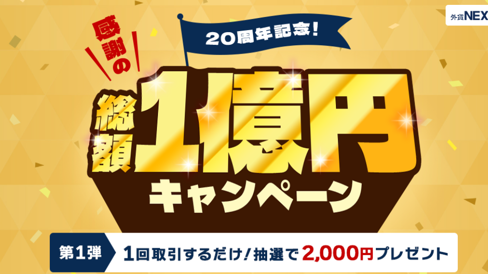 20周年記念イヤーを通し一年間で総額1億円をお客様へ提供するキャンペーンを実施。その第1弾として、「新規取引」を行ったお客様の中から抽選で12,500名様に現金2,000円をプレゼントします。