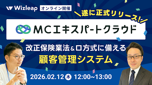 お金の相談プラットフォーム「マネーキャリア(https://money-career.com/)」を運営する株式会社Wizleap(東京都渋谷区、代表取締役 谷川昌平)が提供する、保険の共同募集における案件配信システム「MCマーケットクラウド」は、2026年2月12日(木)に、保険代理店を対象とした無料オンラインセミナー『【遂に正式リリース!】MCエキスパートクラウド-改正保険業法&ロ方式に備える顧客管理システム-』を開催いたします。
