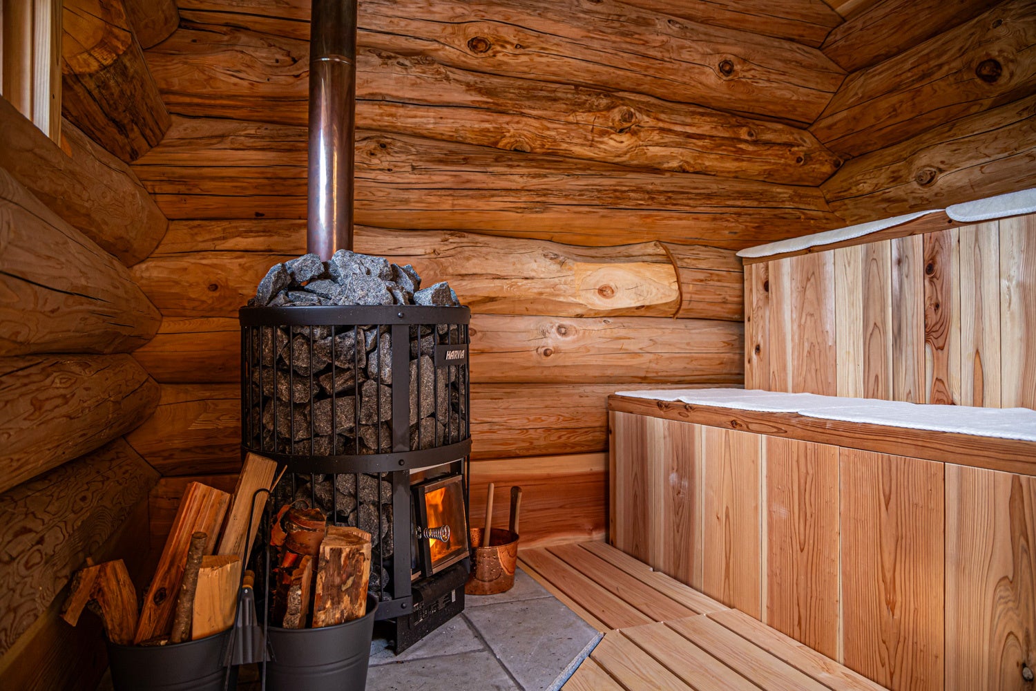 各棟には薪ストーブを備えたプライベートサウナスペースを完備。