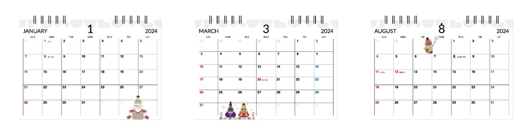 仕様:1月始まり、マンスリータイプ(2024年1月〜2024年12月)、日曜始まり