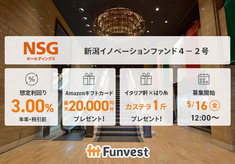 「未来をわかちあう投資」を提供する「Funvest(ファンベスト)」(以下、Funvest)は、「NSGホールディングス 新潟イノベーションファンド4-2号」(以下、本ファンド)の募集を5/16より開始しますので、お知らせいたします。