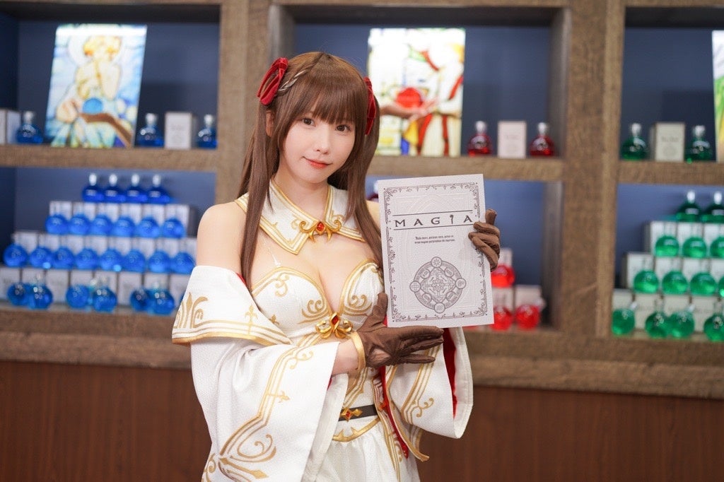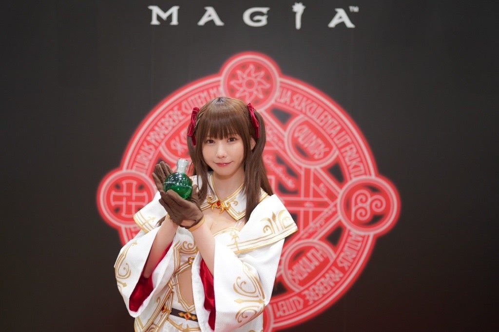 MAGIAメインヒロインである白魔導士「アルテミシア・レイヴンクロフト」姿のえなこは、まさにファンタジーの世界から抜け出した容姿で、多くの来場者を魅了しました。