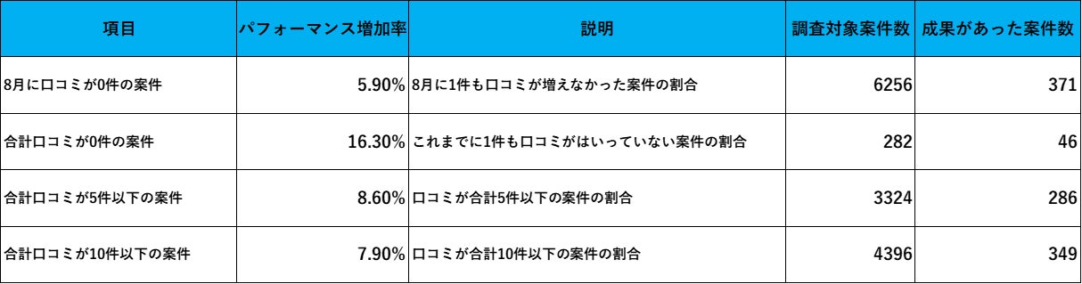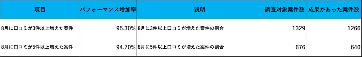 累計口コミ数に伴うパフォーマンスと成果
