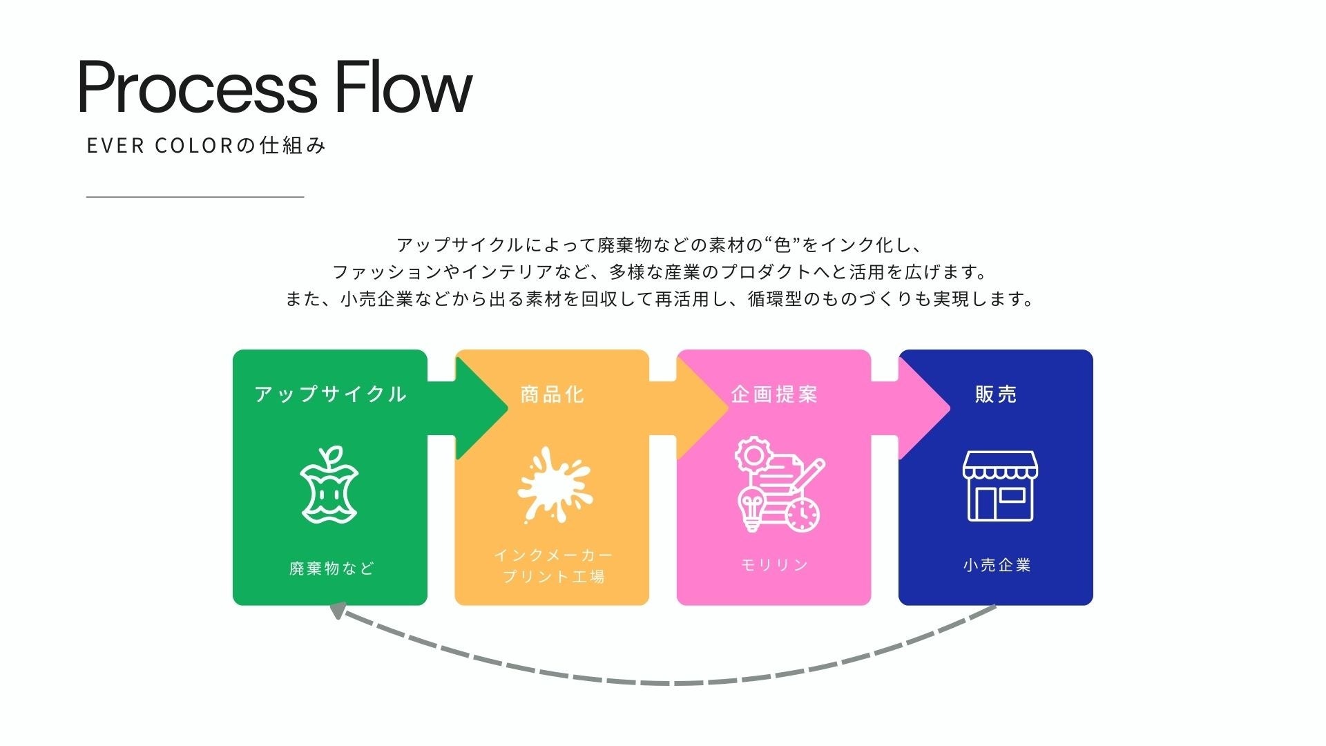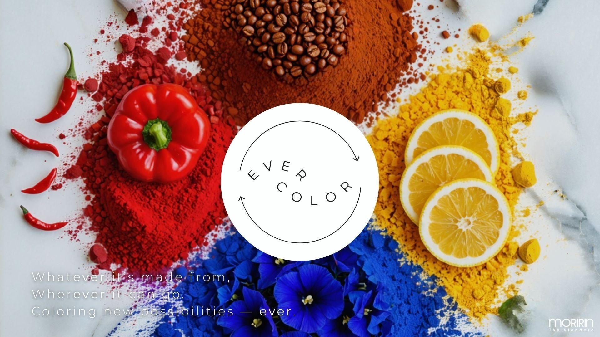「EVER COLOR」は、廃棄物や副産物など、これまで行き場のなかった素材や活用の場が限られていた素材の“色”を抽出し、サステナブルなインク(顔料)へとアップサイクルするプロジェクトで、モリリンがハブとなり、素材を排出する企業、インクメーカー、プリント工場、そして製品化を目指すメーカーや小売企業を繋ぎ、新たな価値を創造します。