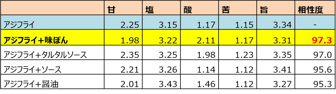 定番のソース、タルタルソースを抑え、アジフライとの相性が最も良かったのは“味ぽん“!アジフライ×味ぽんの相性度は97.3点で、比較対象の中で一番の相性という結果になりました! (※1)