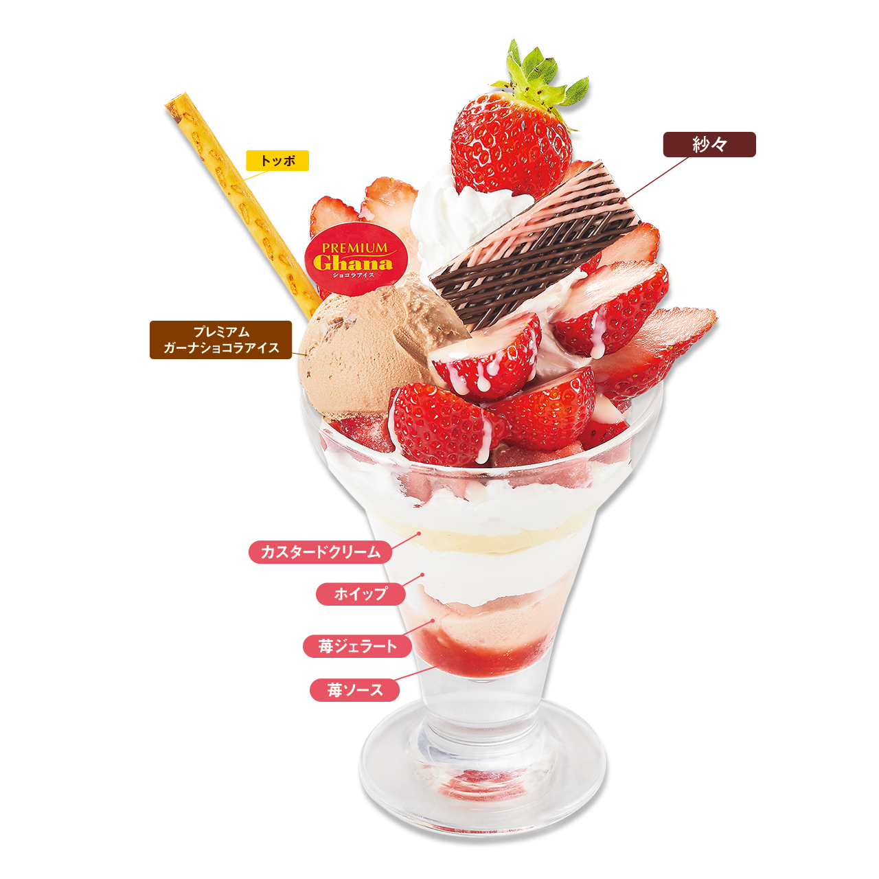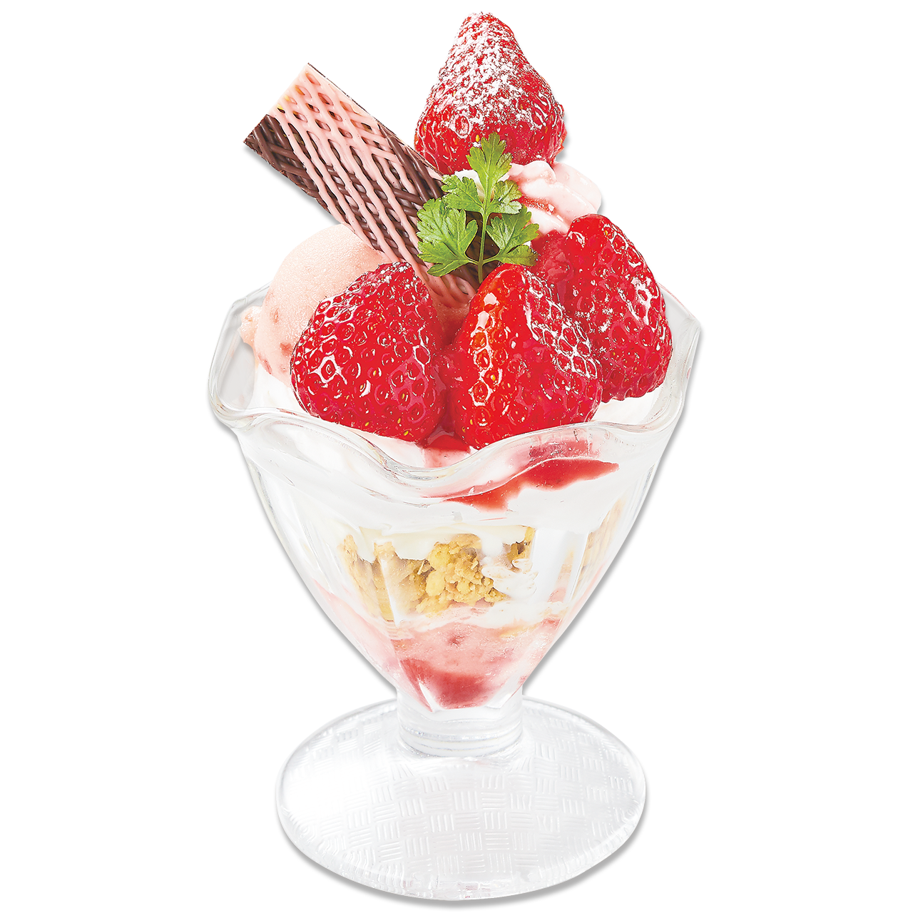 旬のフレッシュな苺を贅沢に盛り付け。濃厚なプレミアムガーナショコラアイスと甘酸っぱい苺ジェラートが織りなす、今だけの魅惑の共演をどうぞ。