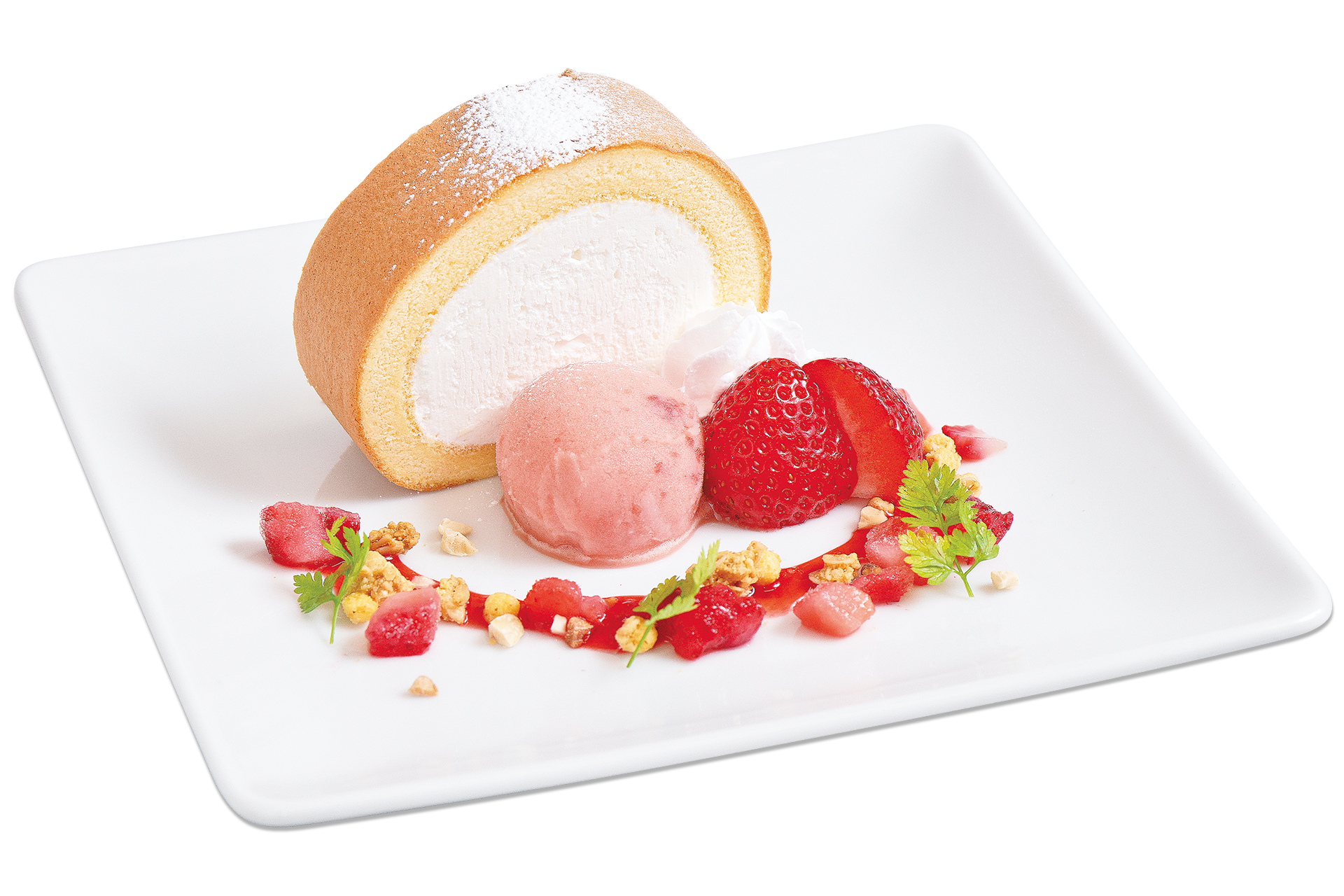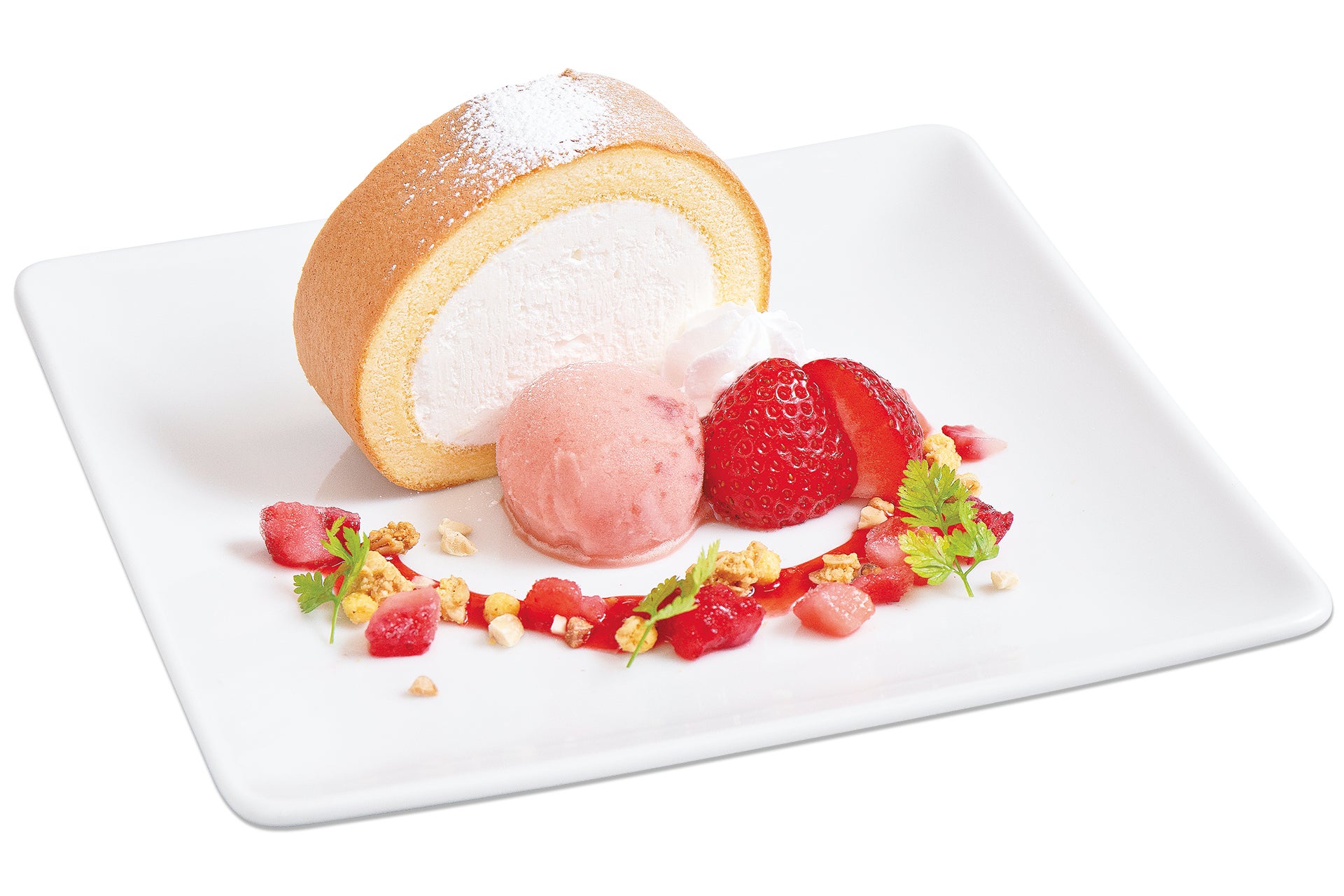 口どけの良いロールケーキに苺ジェラートを添えて。ひんやりとしたジェラートと苺の果肉が、食後のひとときを爽やかに締めくくります。