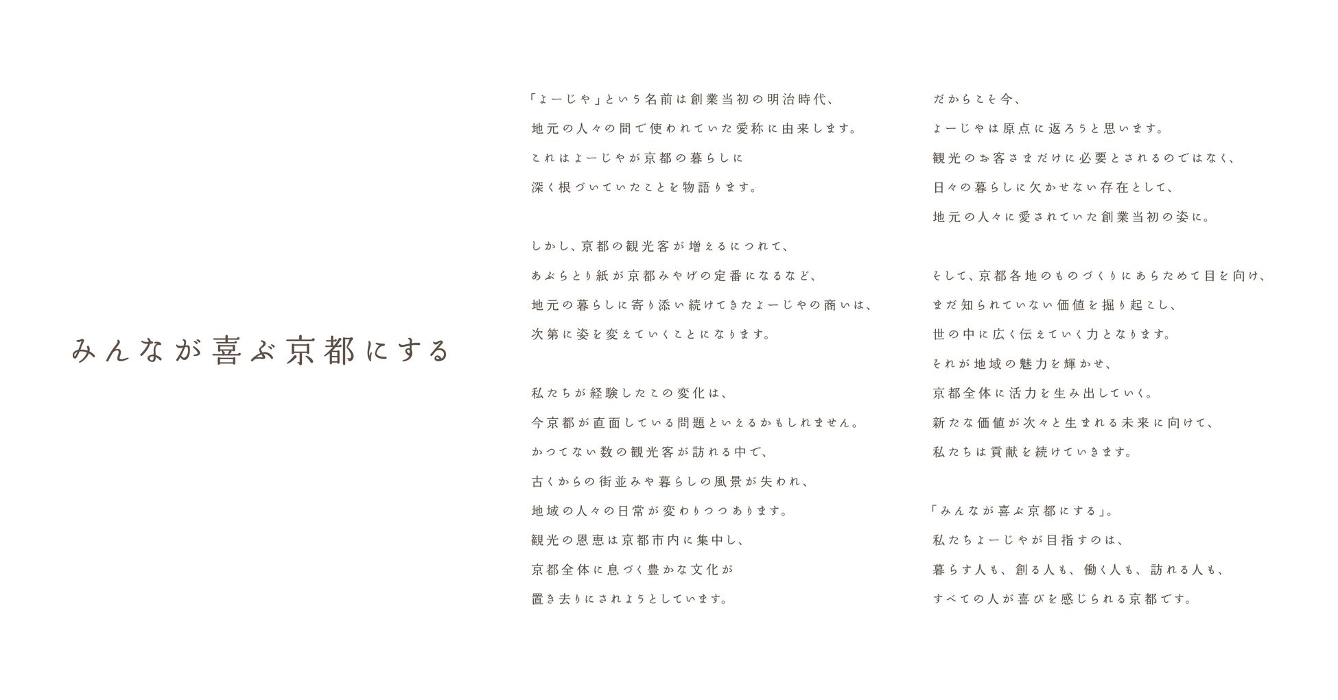 これまで培ったよーじやブランドを、観光のお客さまだけでなく、地域のみなさまにとってもおなじみのブランドにしていくことはもちろん、本業以外でも京都に貢献できる企業でありたい。そのような想いを持って活動する企業であることをみなさまに知っていただきたく、今回のリブランディングを実施する運びとなりました。