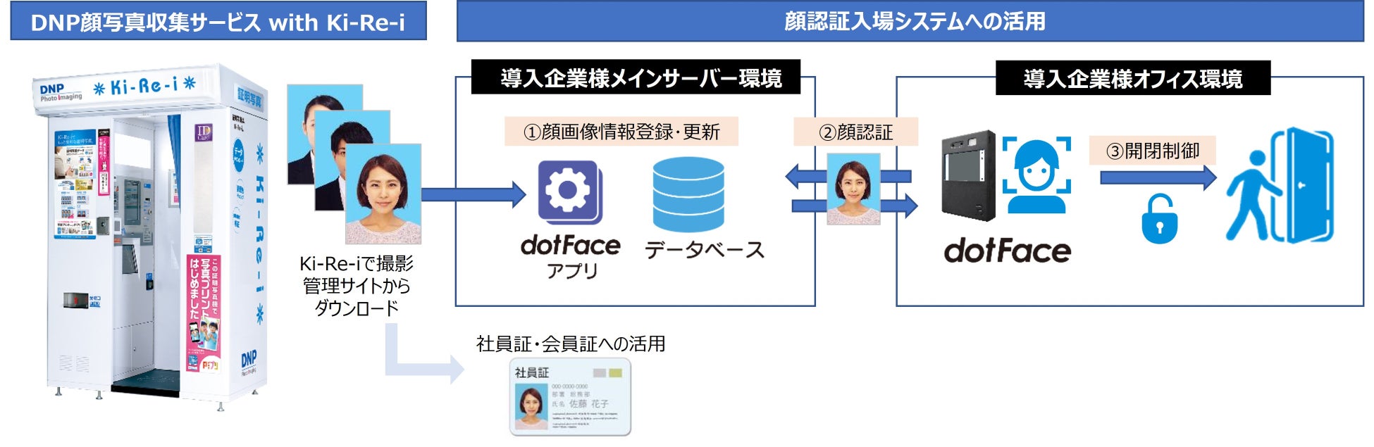 当システムは、「DNP顔写真収集サービス with Ki-Re-i」*2と、dotBravo株式会社が運用する顔認証システム「dotFace」を連動させたものです。国内で運用している約5,600台の「Ki-Re-i」で撮影した顔写真のデータをリモートで集め、このデータを活用した顔認証によって、非接触での入退室管理と検温を同時に可能にします。顔写真の撮影から、顔認証によるセキュリティリスクと感染症リスクの低減まで、ワンストップで行うことができます。