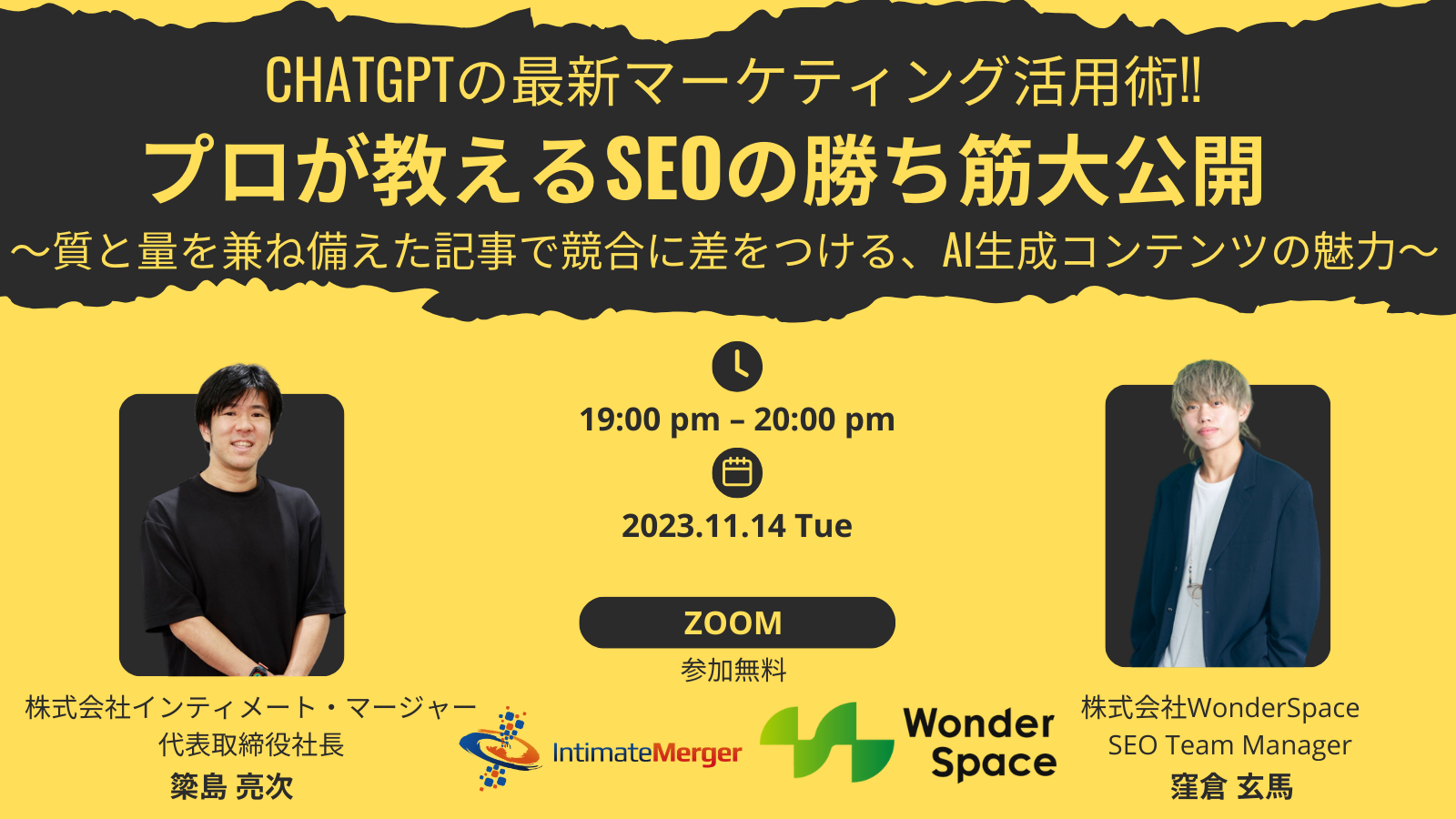 そこで今回、ChatGPTの可能性に焦点を当てたパネルディスカッション形式のセミナーを開催いたします。当日は、日経クロスウーマンやダイヤモンド・オンライン、週間東洋経済など、多くのメディアからChatGPTに関する取材を受けている注目の企業、株式会社インティメート・マージャー代表取締役社長の簗島氏と、過去に「ChatGPTをSEOに活用する方法」のセミナーで注目を集めた、株式会社WonderSpaceSEOチームのマネージャー窪倉が登壇します。