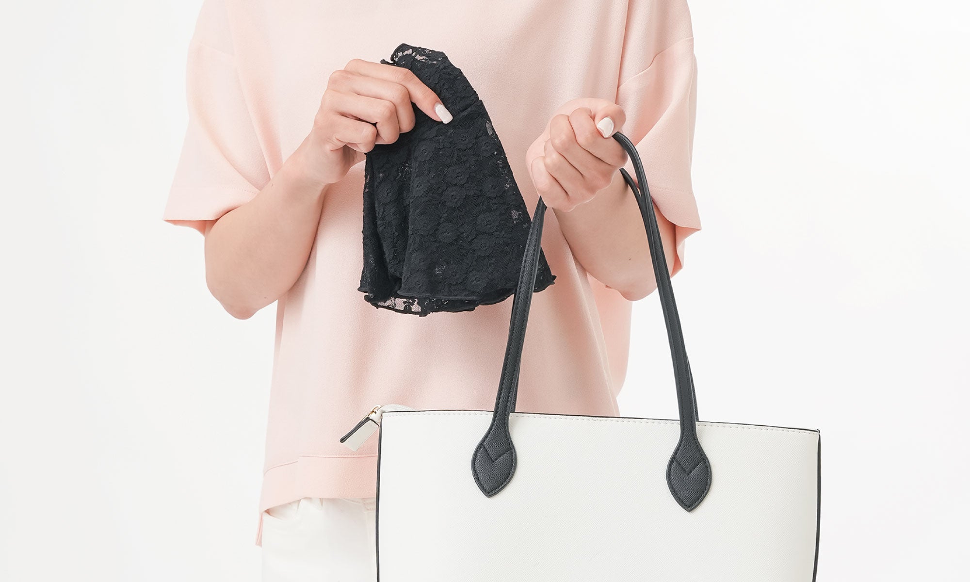 シワになりにくい素材で小さく折りたためるので、バッグに入れてもかさばらず、持ち運びに便利です。