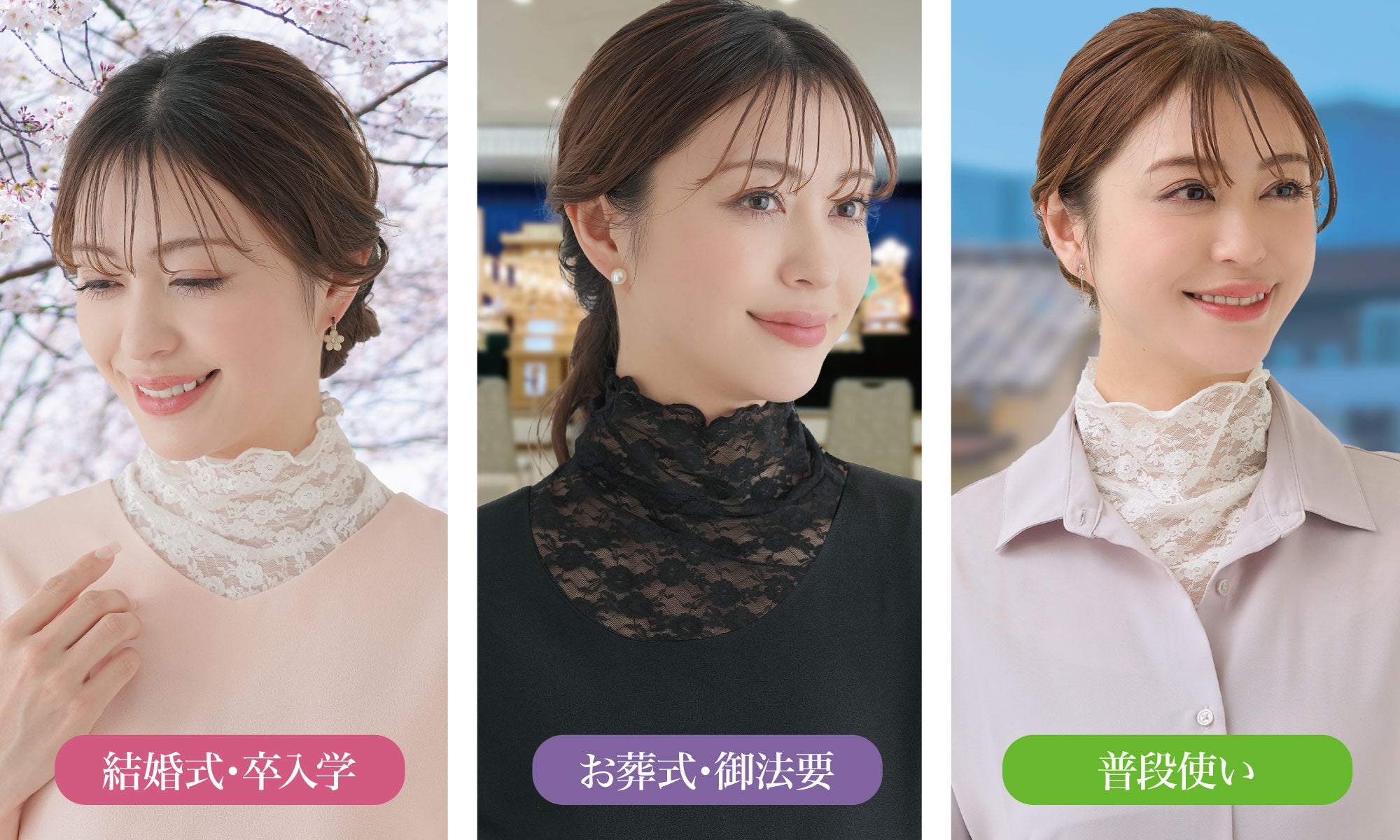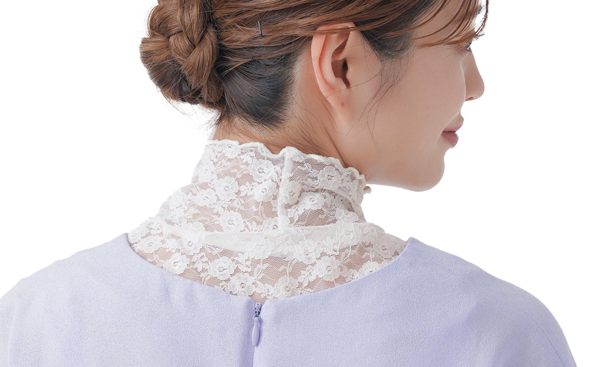 首元が丸く開いたフォーマルウェアもレースネックカバーを着用すれば上品にカバーできます。
