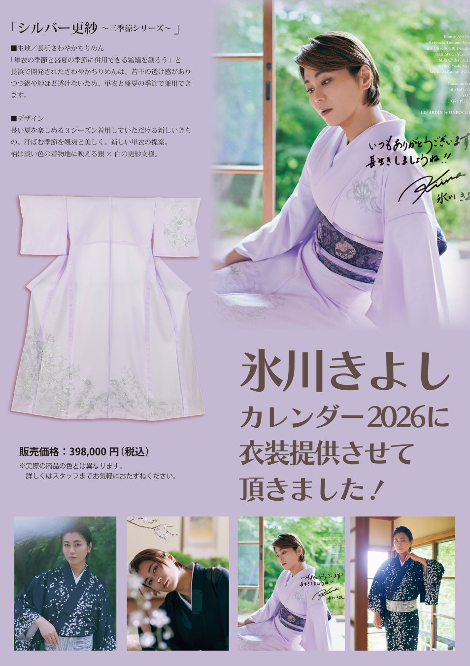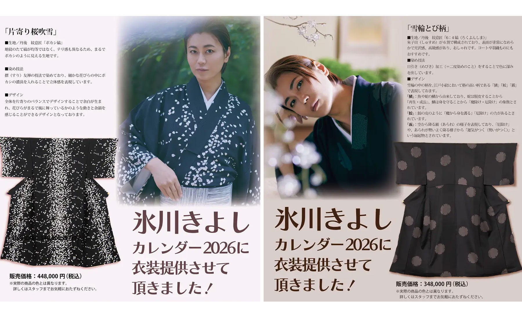 まるやま・京彩グループは、2026年5月7日(木)~12日(火)に自由が丘まるやま本店で開催する「創業55周年記念 遊美の会【展示即売会】夢の空間2026」において、氷川きよしさんの2026年度カレンダー撮影で着用された提供衣装の展示を追加いたしました。