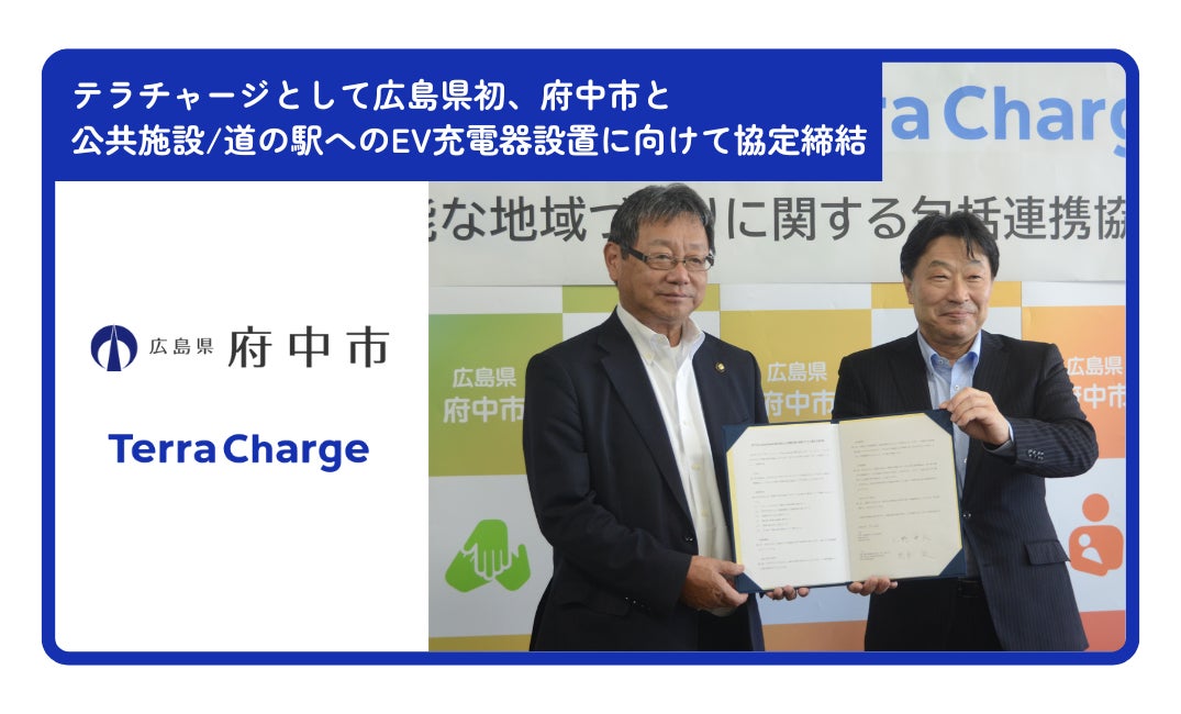 EV充電インフラ事業「Terra Charge(テラチャージ)」を展開するTerra Charge 株式会社(本社:東京都港区、代表取締役社長:徳重徹、以下「当社」)は、広島県府中市(読み:ふちゅうし)と、「府中市とTerra Charge株式会社との持続可能な地域づくりに関する協定」(以下「本協定」)を2024年7月23日に締結しました。