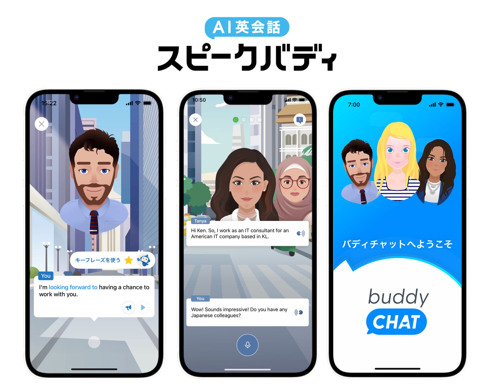 「スピークバディ」は2016年9月にリリースした日本発のAI英会話アプリで、「感情表現豊かなキャラクター(AIバディ)との対話」を通じて、体系的に発音やフレーズ、単語、イディオムなどを学びます。第二言語習得理論に基づく学習方法を、音声認識や生成AI、自然言語処理、機械学習といった最新鋭のテクノロジーとのコラボレーションで実現しています。