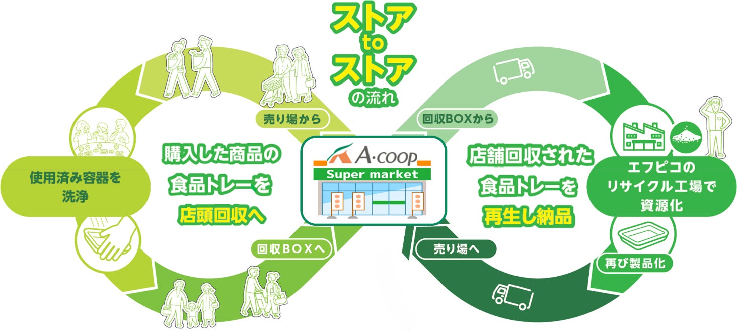株式会社エフピコ(本社:東京都新宿区、代表取締役会長:佐藤 守正、以下「エフピコ」)と株式会社Aコープ九州(本社:福岡県福岡市、代表取締役社長:田中 孝樹、以下「Aコープ九州」)は福岡県14店舗、佐賀県16店舗、大分県12店舗の合計42店舗において、地域の皆さまと共に水平リサイクル※1の協働を強化する「エコストア協働宣言」をいたします。