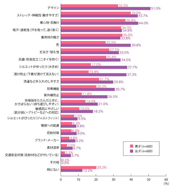 体操服で重視することは、「デザイン」(男子32.5%、女子51.0%)が最も多く、女子生徒の約半数がデザインを重視するポイントとしてあげています。続いて、「ストレッチ・伸縮性(動きやすさ)」(男子39.8%、女子43.7%)、「着心地・肌触り」(男子36.8%、女子44.0%)、「吸汗・速乾性(汗を吸って、速く乾く)」(男子34.3%、女子34.8%)、「着用時の軽さ」(男子35.0%、女子33.8%)などが、男女ともに重視する項目となっています。